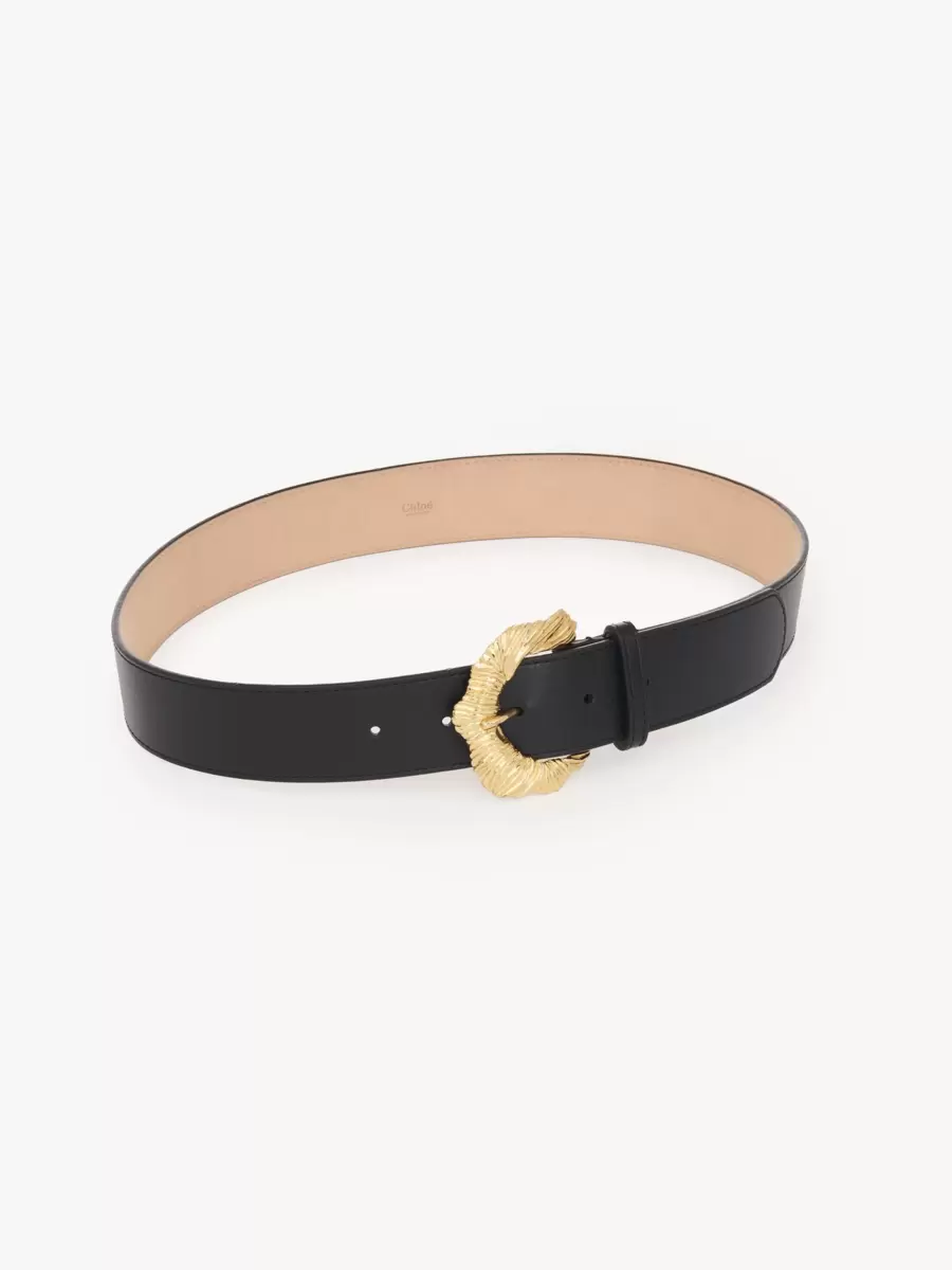 Chloé Flowers belt in soft calfskin with a gold brass C-shaped buckle inspired by the Maison’s heritage. The hand-crafted texture creates an artisanal aesthetic. Fastened by a pin buckle, the everyday belt will elevate dresses and pants alike.