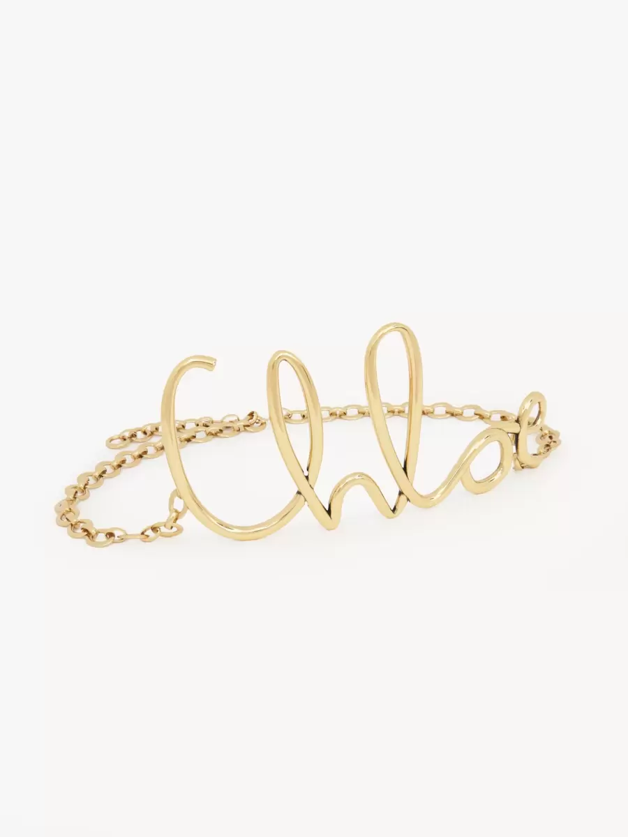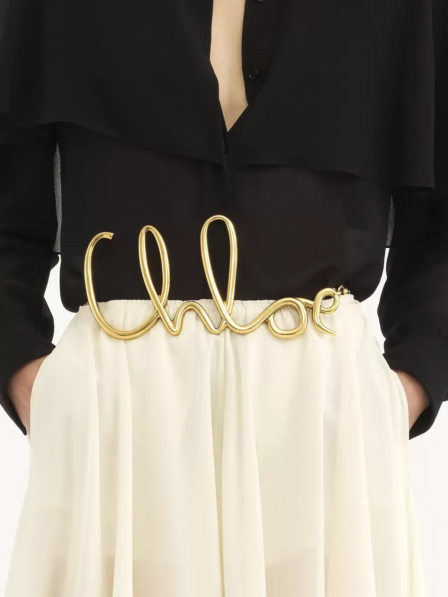 Chloé Iconic large chain belt inspired by a design rooted in the Maison’s heritage. The modern reinterpretation combines a chain with a Chloé logo in gold brass. Linked to Chloé’s jewelry line, the belt can be worn high on the waist or low on the hips.