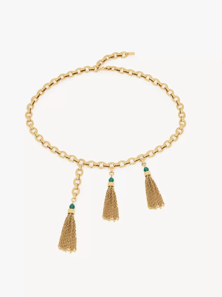 Chloé Pompoms jewelry belt in vintage gold brass. The adjustable chain features meticulously hand-assembled chain tassels and crystal glass emerald pearls. Adjust the chain to wear the belt high on the waist or low on the hips, depending on your silhouette.