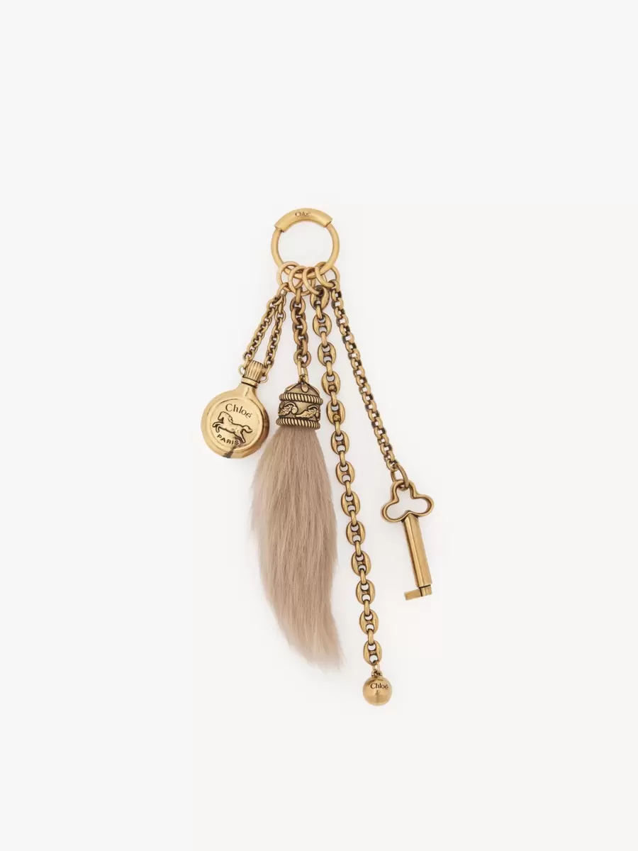 Crafted from gold brass, this Chloé Symbols bag charm combines multiple chains of different lengths with shearling embellishment, a key and miniature sphere pendants, and the Maison’s Horse Medal.