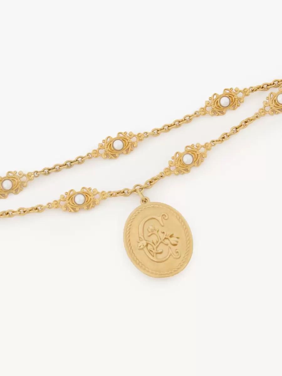 Château Treasures double-chain bracelet in vintage gold brass with a double-sided, floral “C” medal centerpiece. Resin pearls embellish the ornamental chain. A gold-tone Chloé logo plate signs this piece.