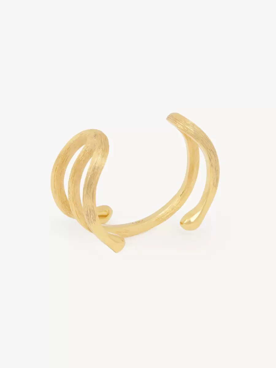 Chloé Eclectic cuff bracelet in vintage gold brass, featuring a wrap-around design that reveals a mix of polished and textured finishes. A Chloé logo engraving signs this piece.