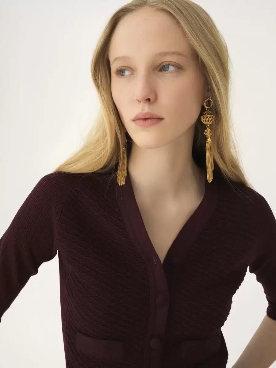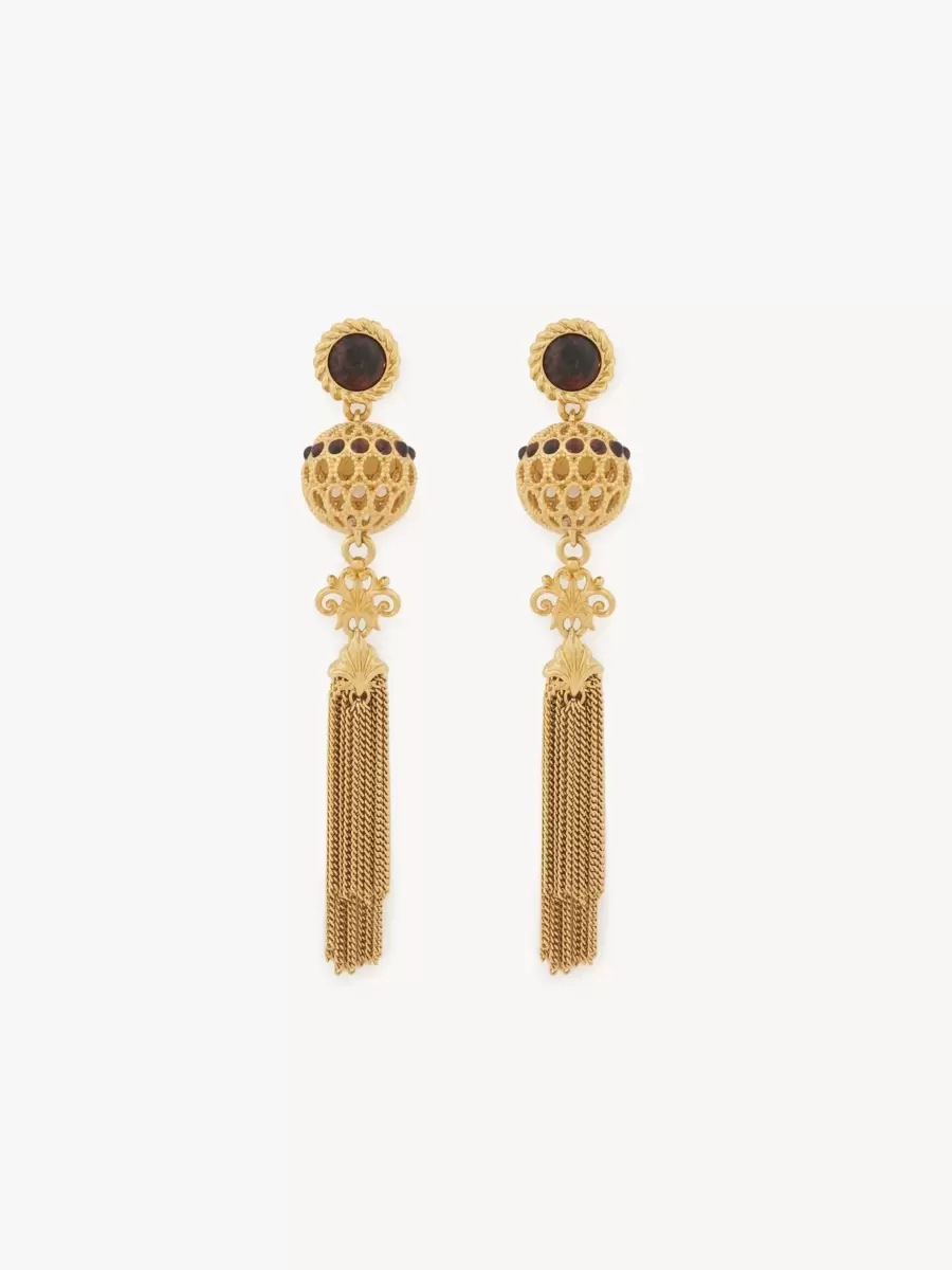 Chloé Eternity dangling earrings in vintage gold brass, combining chain tassels with an openwork sphere, ornamental pieces and brown obsidian studs. A Chloé logo engraving signs these earrings.
