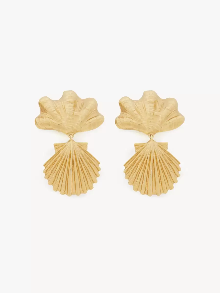 Chloé Shells earrings in vintage gold brass, featuring two large shells in different shapes. A Chloé logo engraving finishes these earrings.