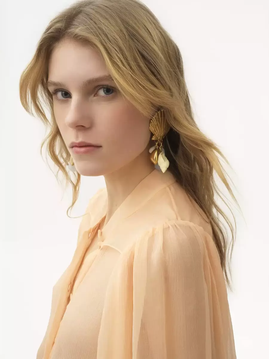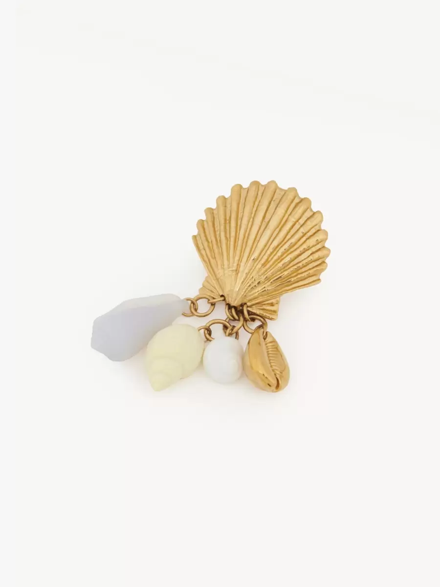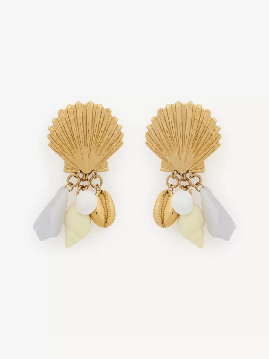 Chloé Shells earrings in a textural combination of gold brass and resin. Large shells are embellished with dangling pendants in colored resin, alongside gold brass shell charms.