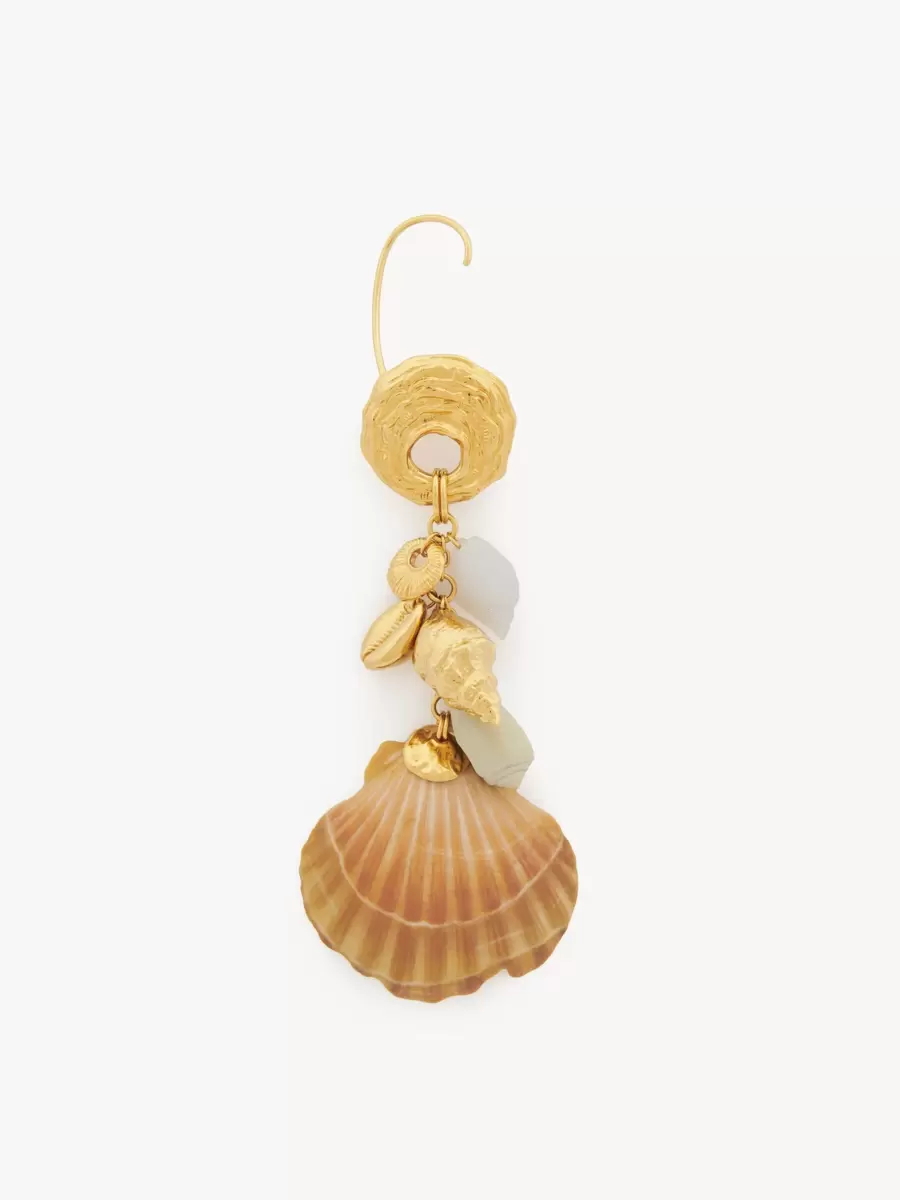 Chloé Shells mono earring in vintage gold brass and resin. Set on a chain dangling from a hammered gold brass link, a large resin shell is combined with a variety of smaller shell pendants in various shapes and textures. A Chloé logo engraving signs this piece.