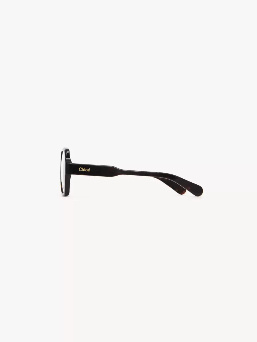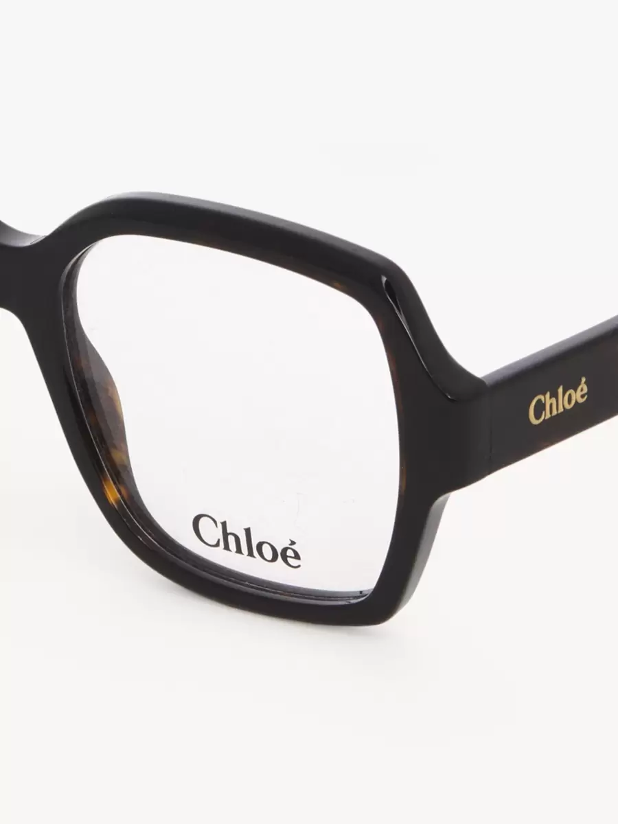 The bold temple shape adds a contemporary touch and is paired with a gold-toned Chloé logo engraving at the left temple. An engraved text on the inside of the right temple indicates the model’s unique composition.
