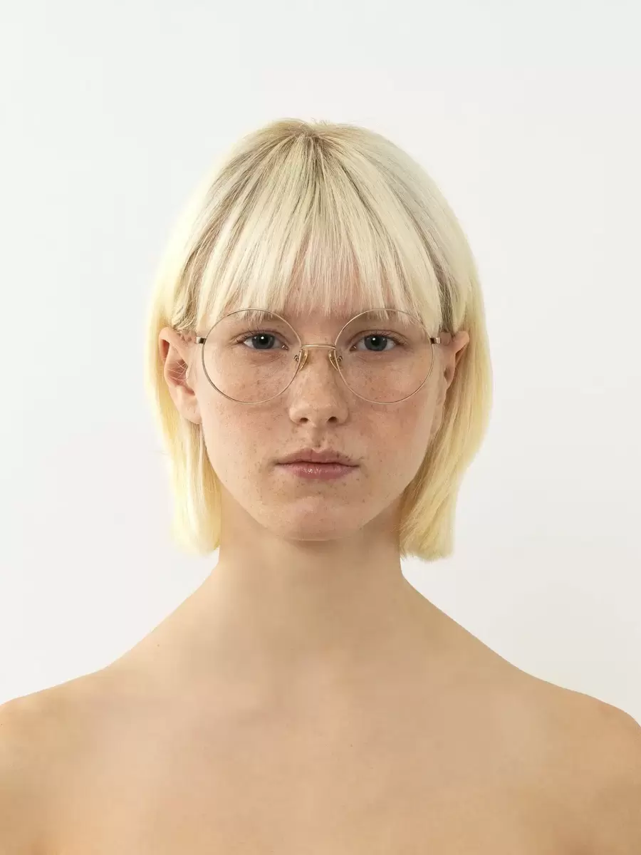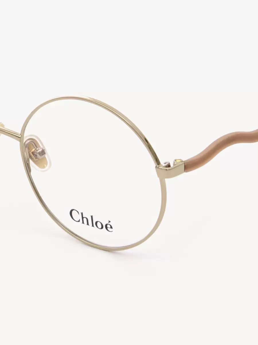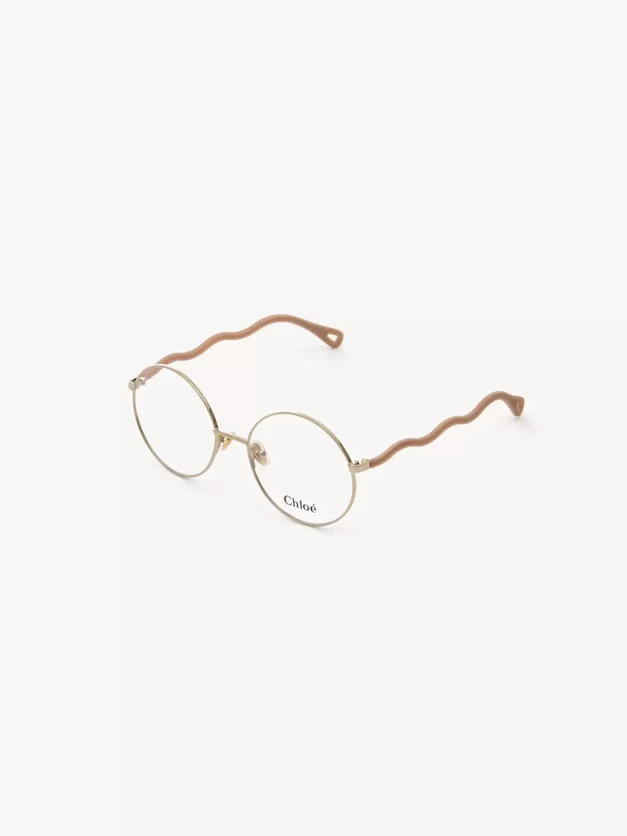 Inspired by Chloé’s iconic scallop, the Noore round eyeglasses exude a feminine, playful attitude with an easy-to-wear shape. The sand metal frame and brown temple create a neutral color palette.