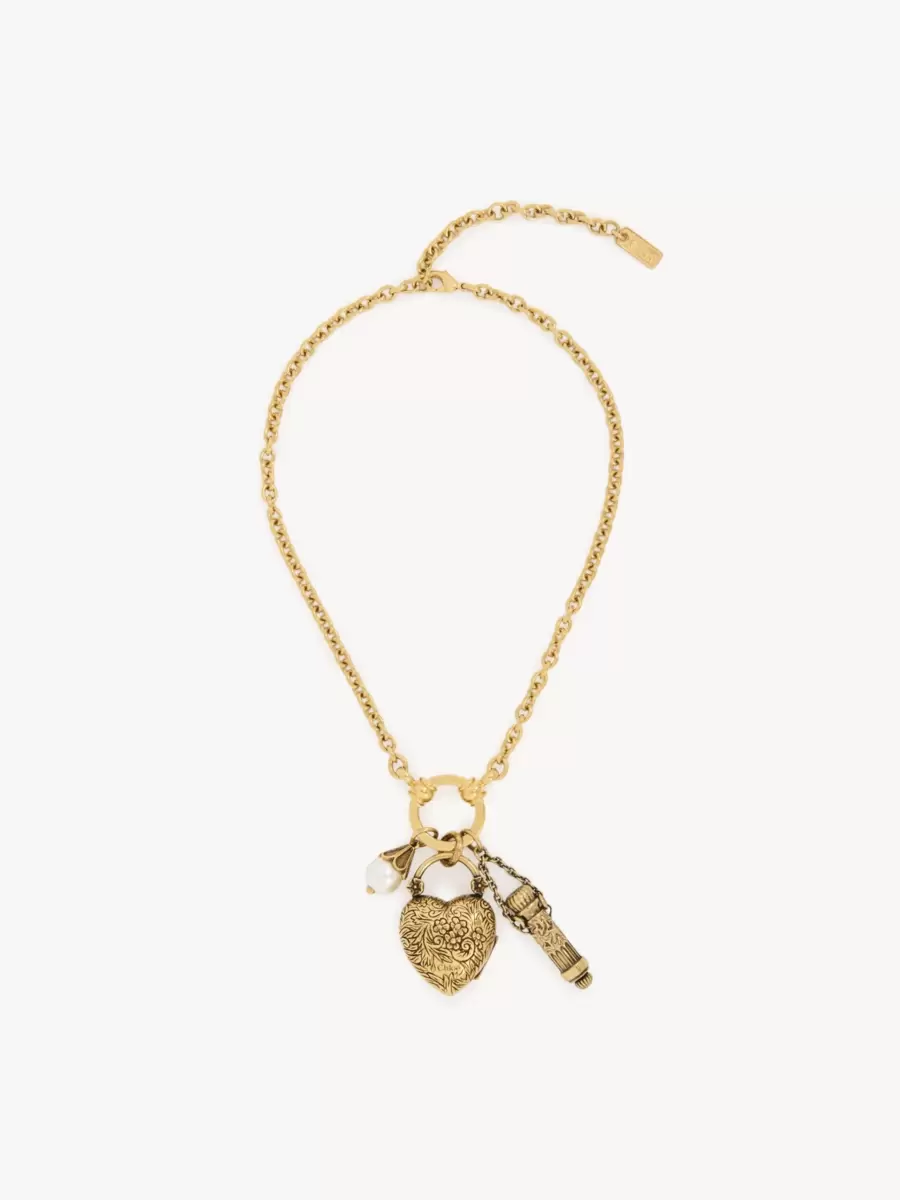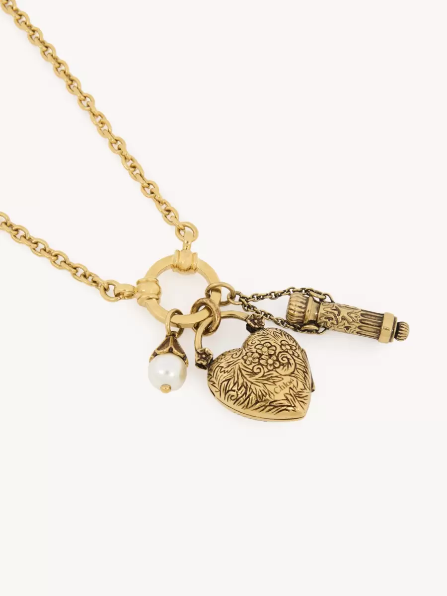 Château Treasures choker necklace in vintage gold brass, featuring three charms set on a central ring: an ornamental heart and vial, along with a glass pearl. The Chloé logo is engraved on the heart, while a gold-tone Chloé logo plate signs the chain.