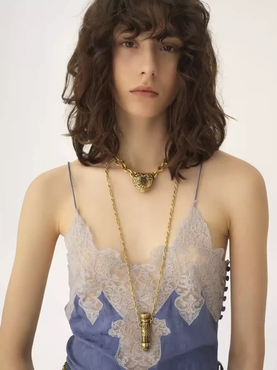 Château Treasures choker necklace in vintage gold brass, featuring a Chloé-engraved ornamental heart pendant embellished with a brown obsidian stone at the center. The chunky chain is finished with a gold-tone Chloé logo plate.