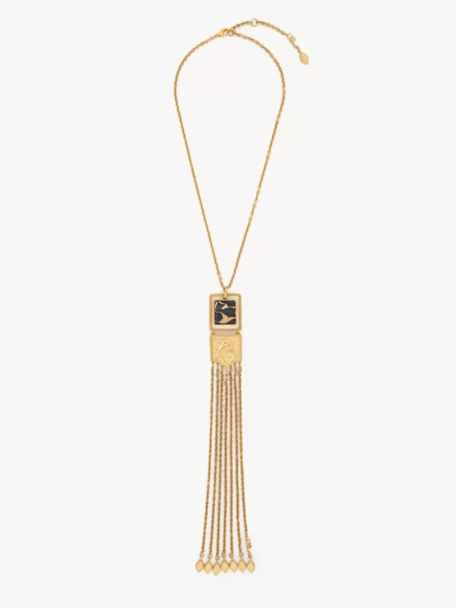 Chloé Amulet necklace in gold brass. A square-shaped pendant is inlaid with a Portoro marble square and linked to a second gold brass pendant with an ornamental engraving. A dangling chain tassel detailed with decorative tips and a subtle Chloé Iconic signature finish this piece.