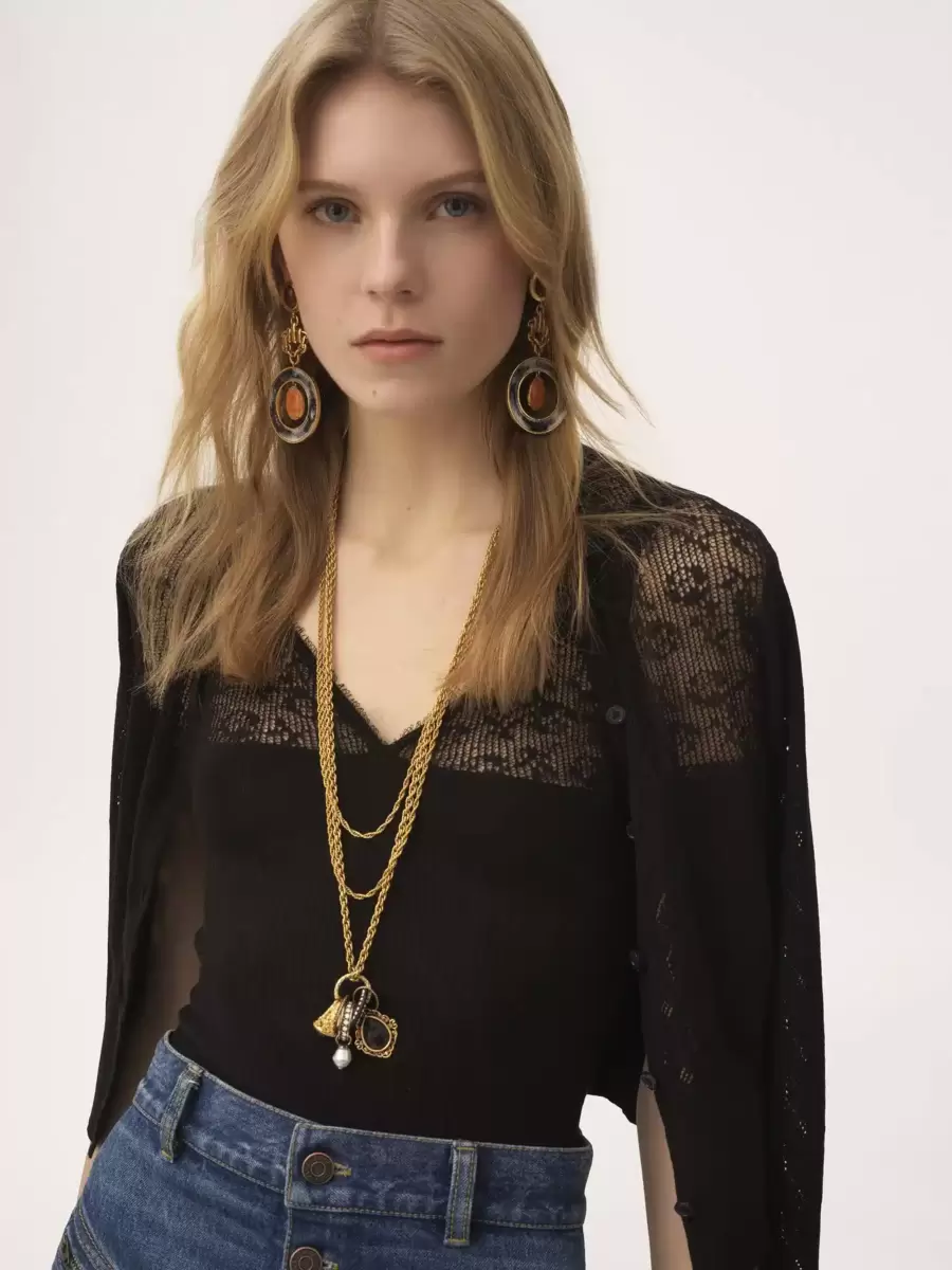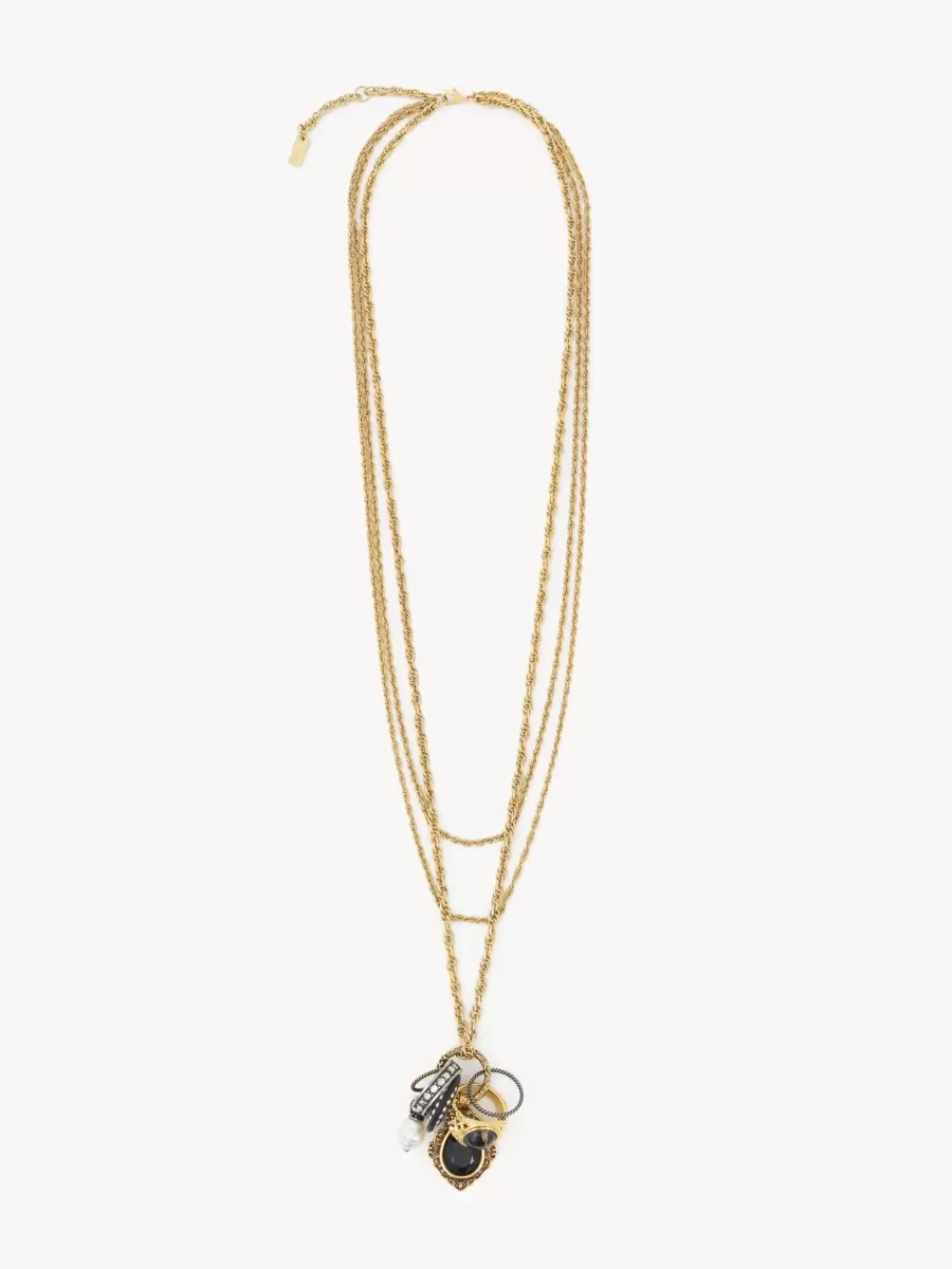 Chloé Antique Pearls layered pendant necklace combining a triple gold brass chain with an ornamental black faceted teardrop pendant and a cluster of five rings with different textures and embellishments. Portoro marble, resin pearls and crystal glass elevate the combination of gold and palladium tones rooted in the Chloé DNA.
