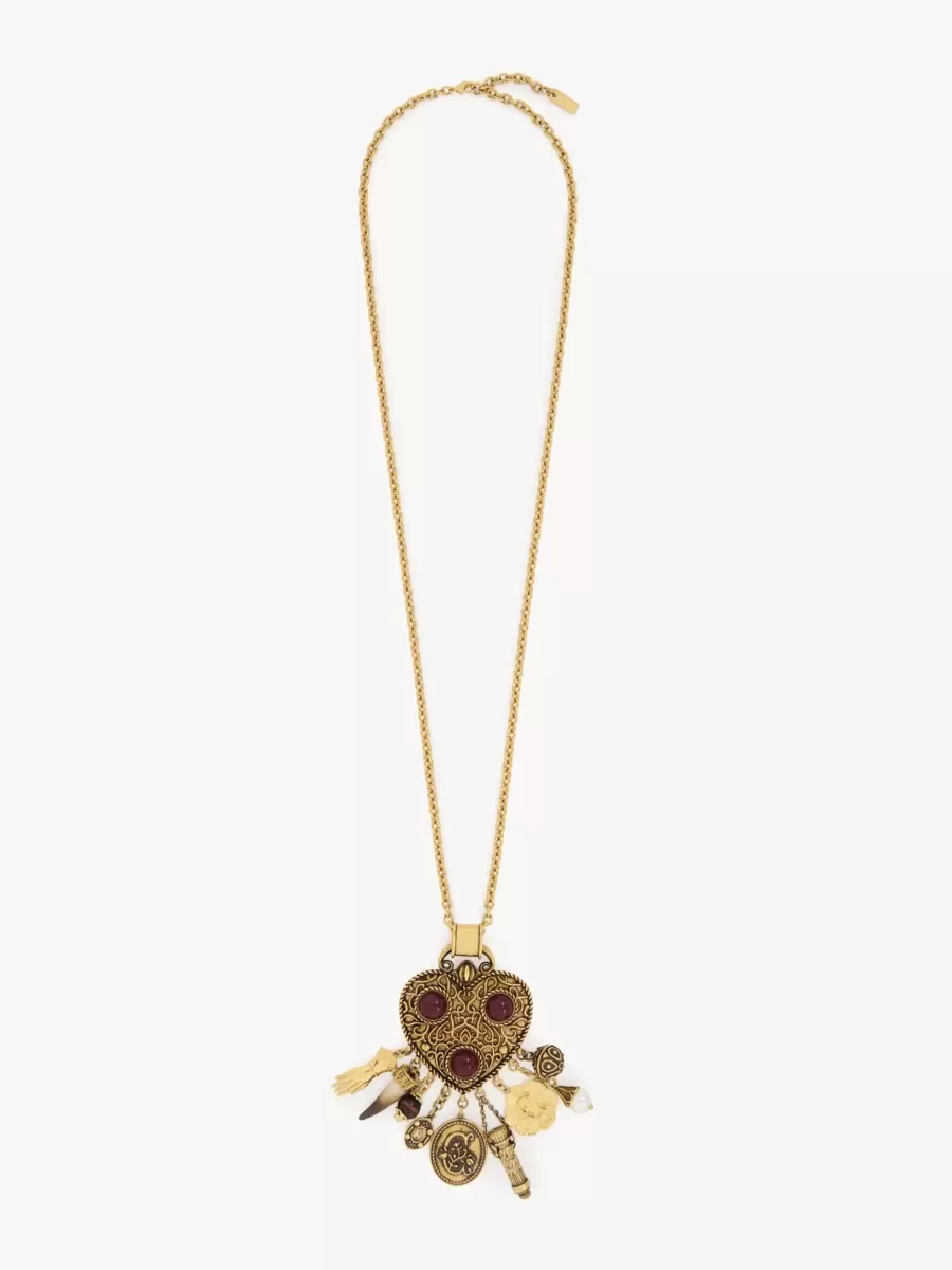 Chloé Heartfull pendant necklace in vintage gold brass, featuring a large, ornamental heart pendant embellished with inlaid burgundy resin. Multiple charms dangle from the heart, depicting vintage treasures in a variety of textures and materials.