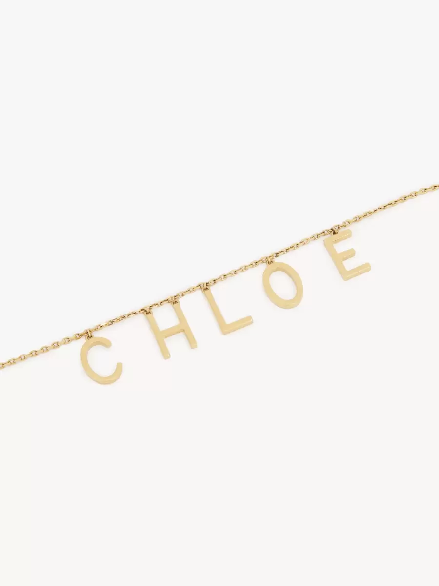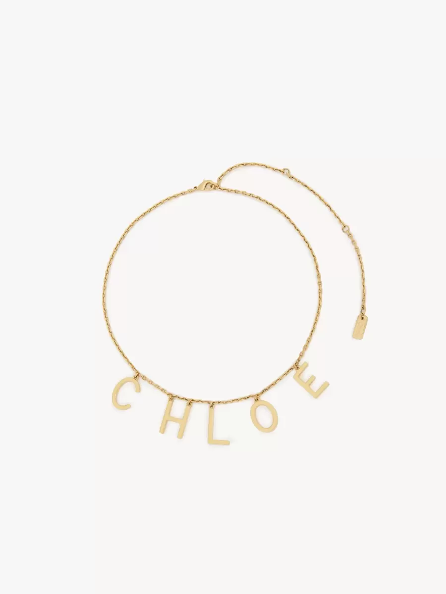 Chloé Letters necklace in vintage gold brass, expressing the Chloé signature through letter charms. The adjustable chain is signed with a gold-tone Chloé logo plate.