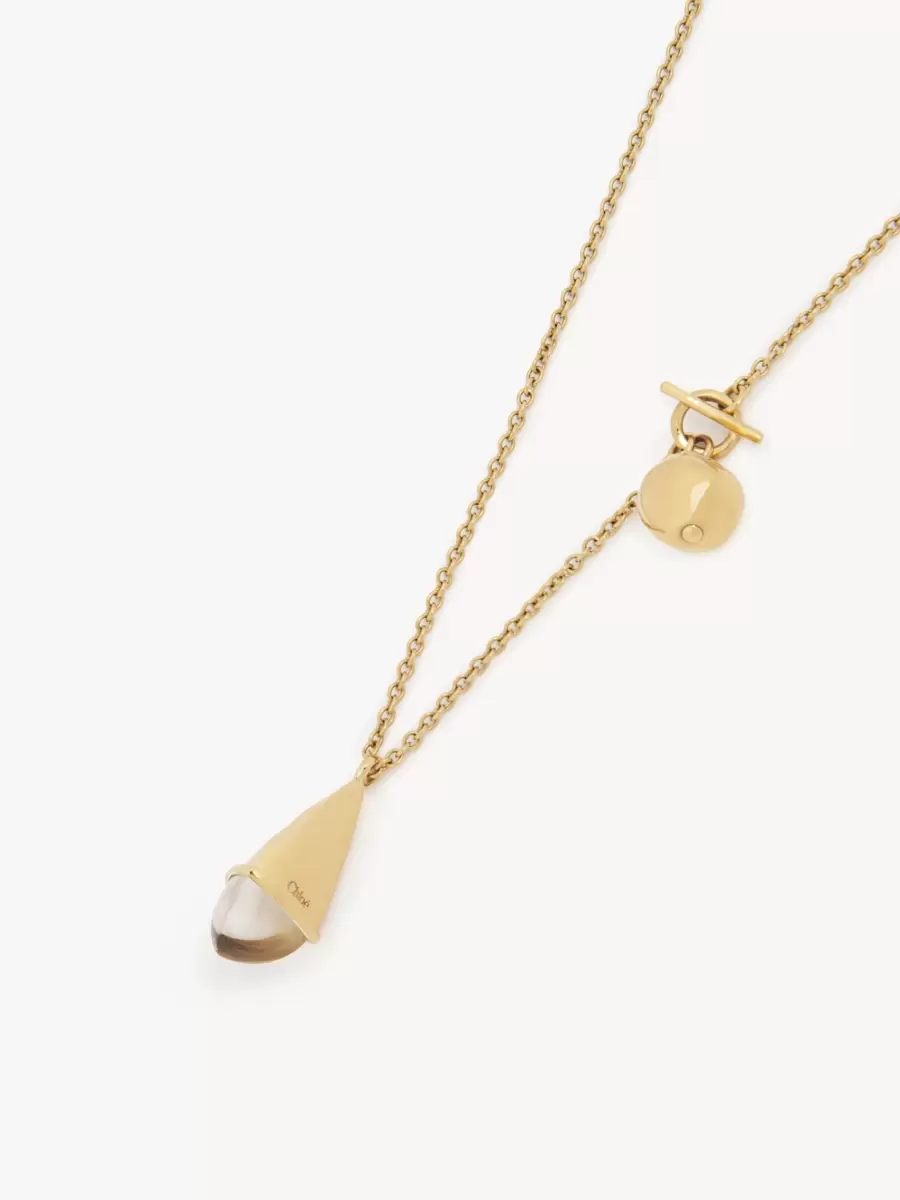 Chloé Prism pendant necklace combining a fine gold brass chain with a central bi-material, faceted pendant detailed with clear resin. A gold brass spherical pendant and T-bar link detail one side of the chain, while a Chloé logo engraving and plate finish this piece.