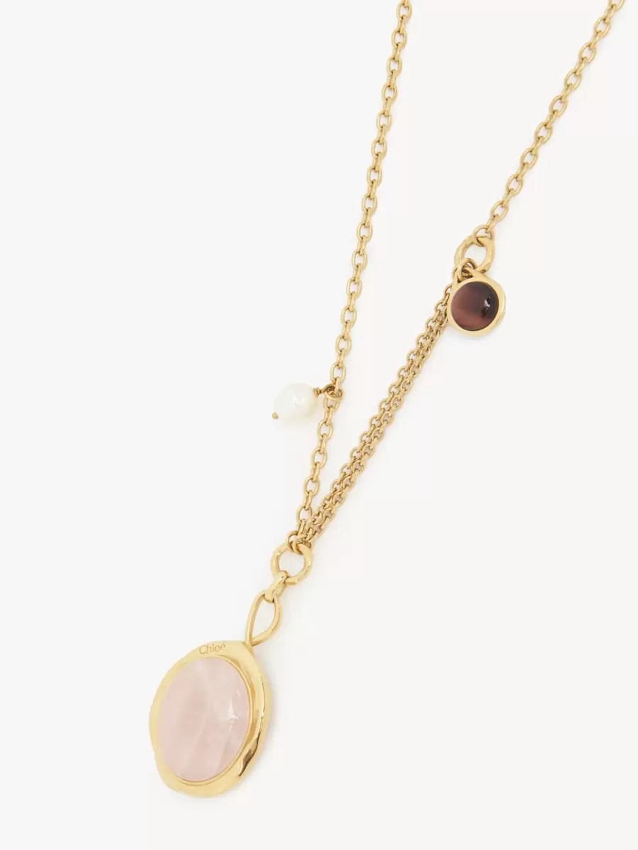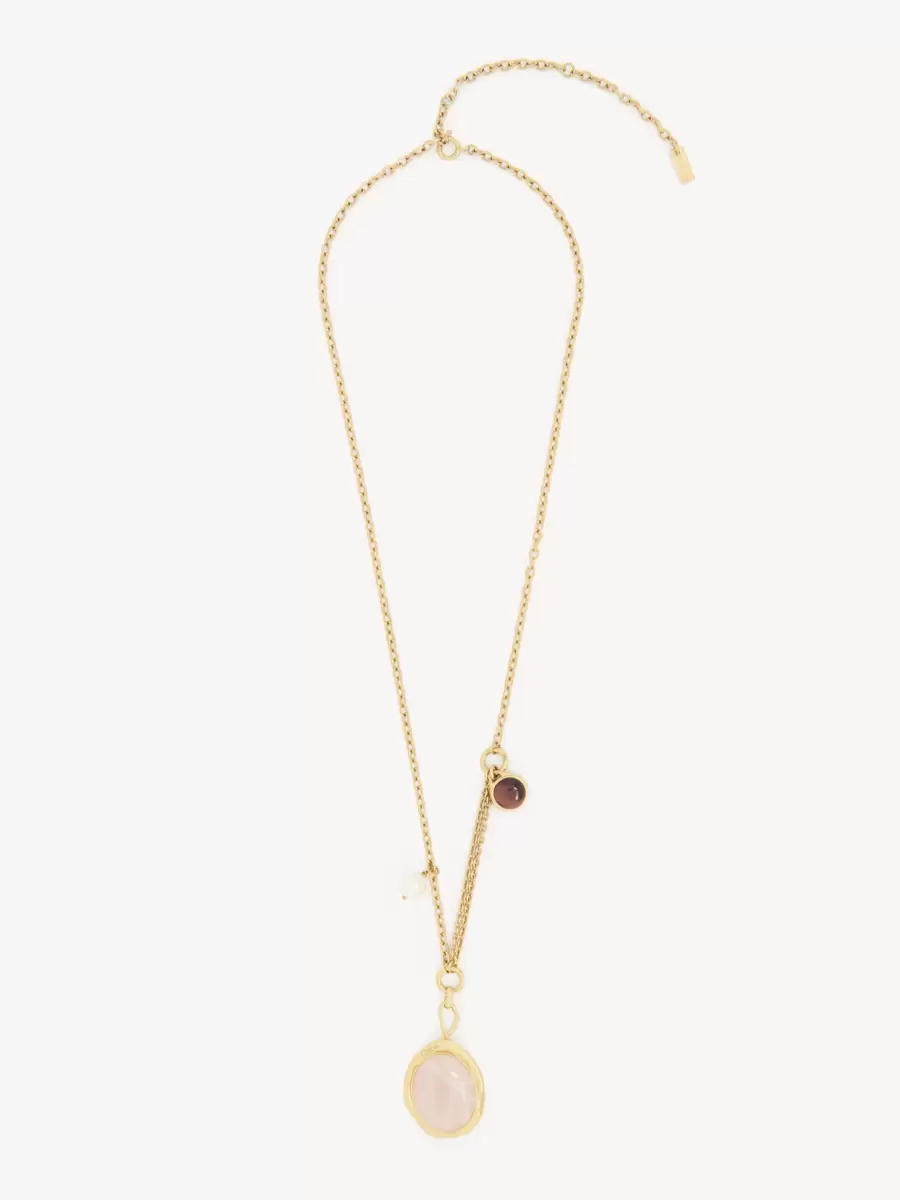 Chloé Senses pendant necklace in gold brass embellished with natural gemstones. Set on an adjustable chain, a large rose quartz pendant is combined with a synthetic pearl and a red tiger’s eye stone on either side of the chain. A Chloé logo engraving signs this piece.