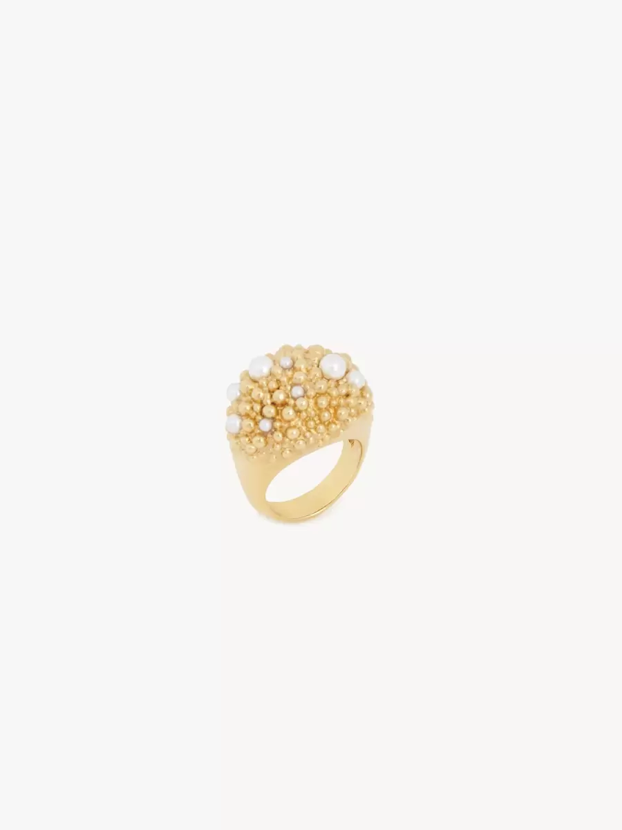 Chloé Shells ring in vintage gold brass, embellished with caviar-effect detail and synthetic pearls. A Chloé logo engraving signs this piece.