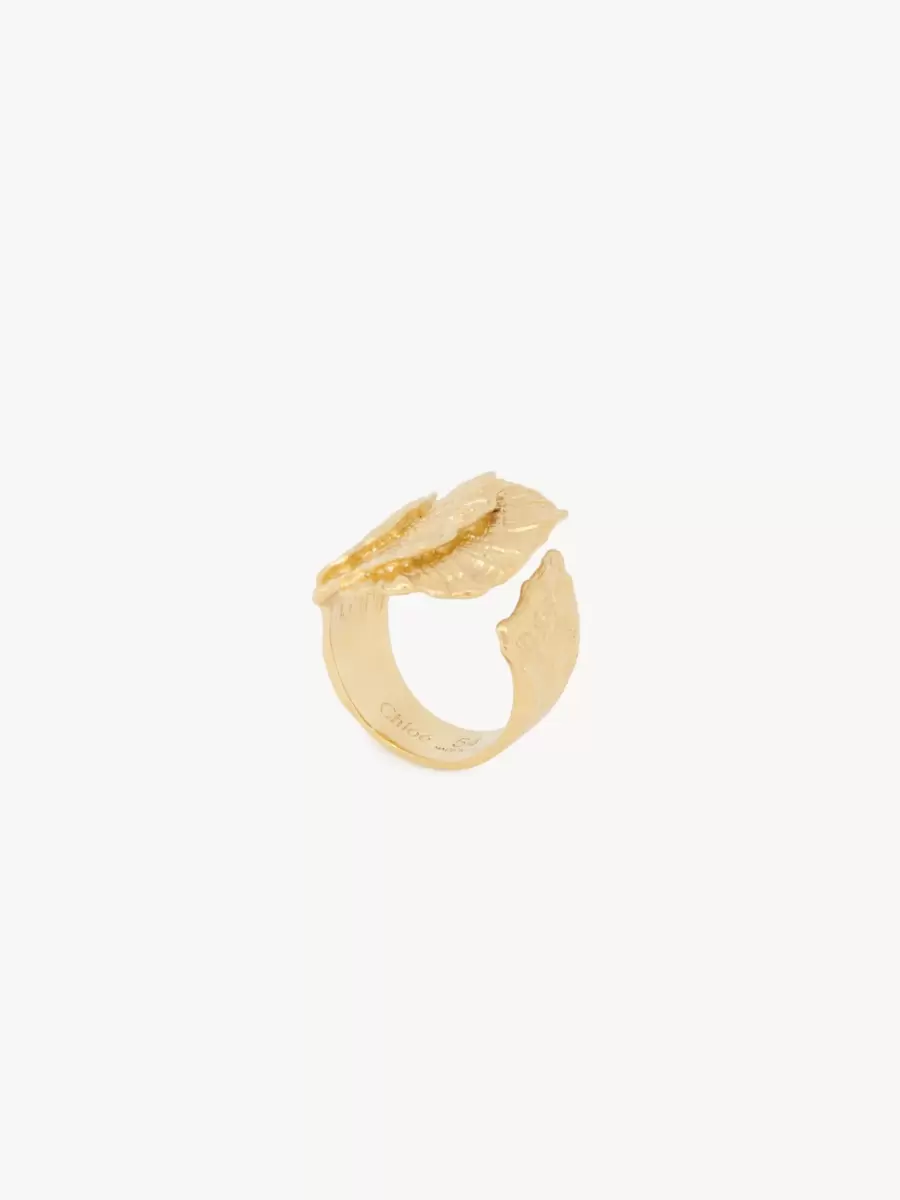 Chloé Shells ring in vintage gold brass, textured to depict a large ginkgo leaf. A Chloé logo engraving finishes this ring.