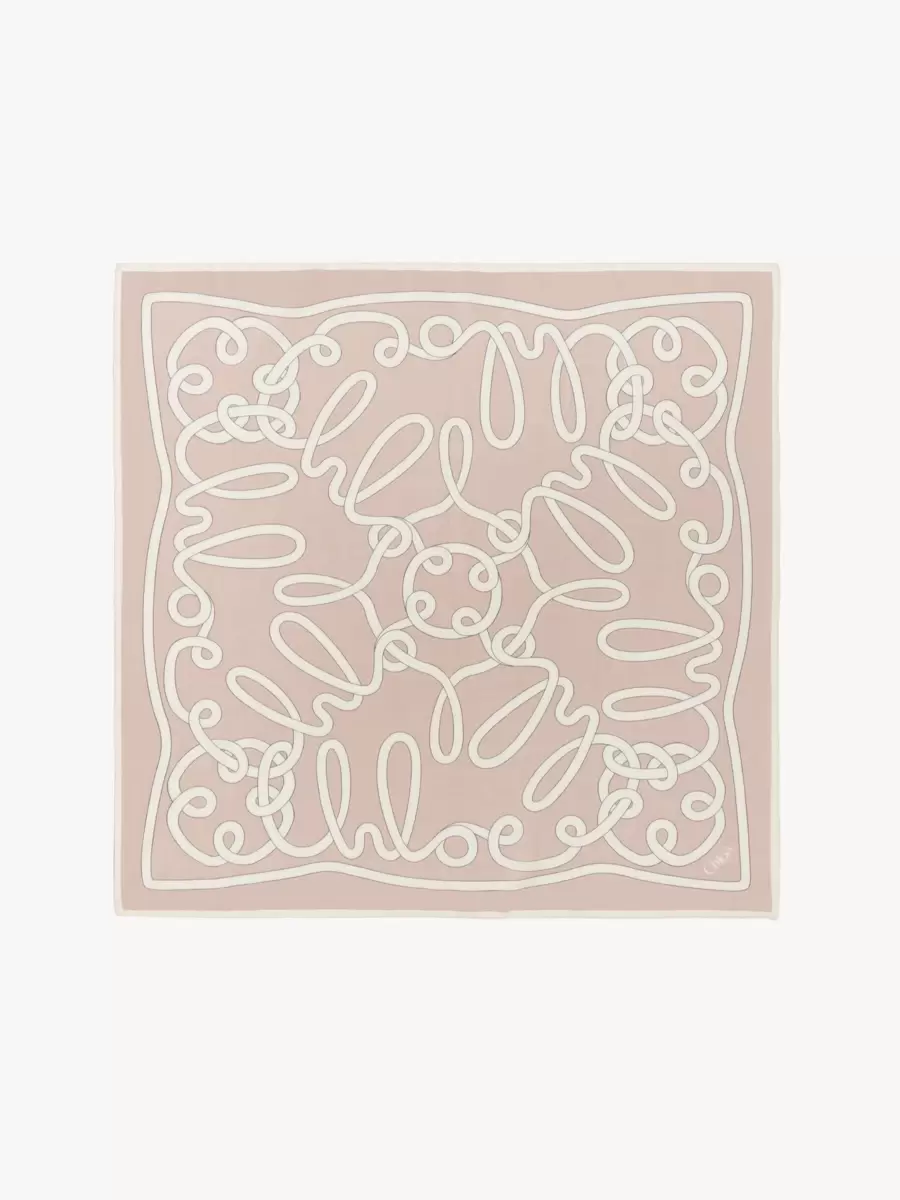 Chloé Iconic Print scarf in an organic cotton and organic silk blend with an inkjet print, cut in a bandana size that is easy to style on the head or neck. Inspired by the Maison’s heritage, interwoven Chloé logos are showcased in a soft, handwritten font, while the lightweight materials play on transparency. A classic Chloé logo print signs the corner.