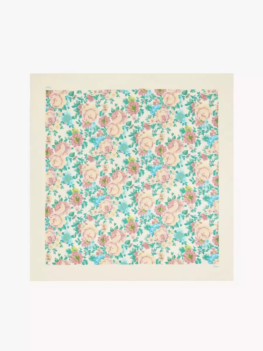 Square scarf in organic silk twill with a floral motif depicting peonies and leaves, inspired by the Maison’s heritage. The inkjet-printed scarf has a plain frame and hand-rolled edges, with a Chloé logo in two corners.