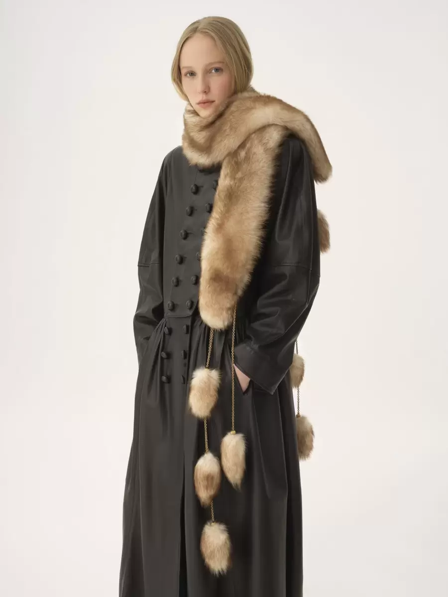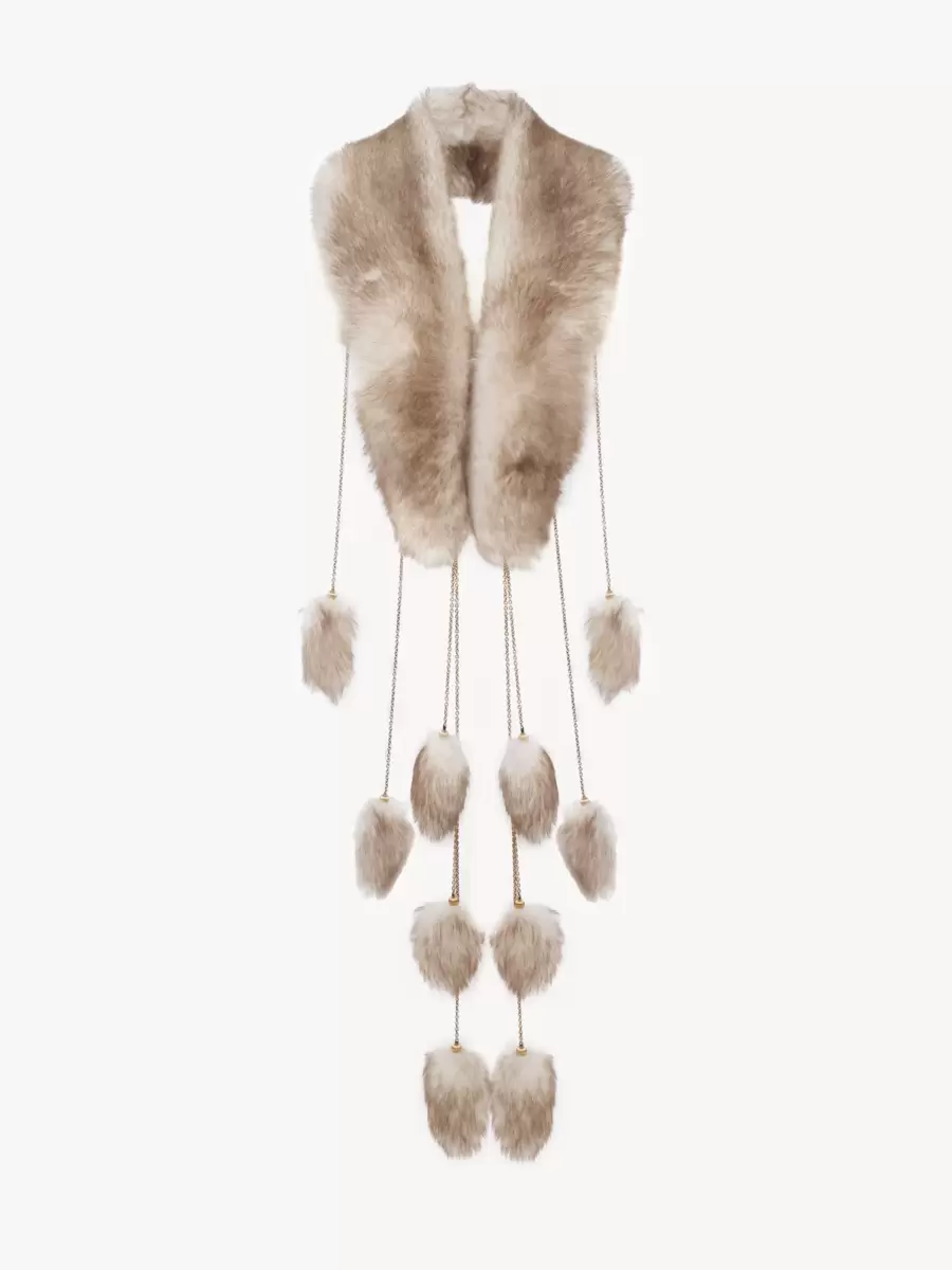 Treasure Tails shearling scarf, combining a large collar scarf with ten pompoms set on dangling gold brass chains for a jewelry effect.