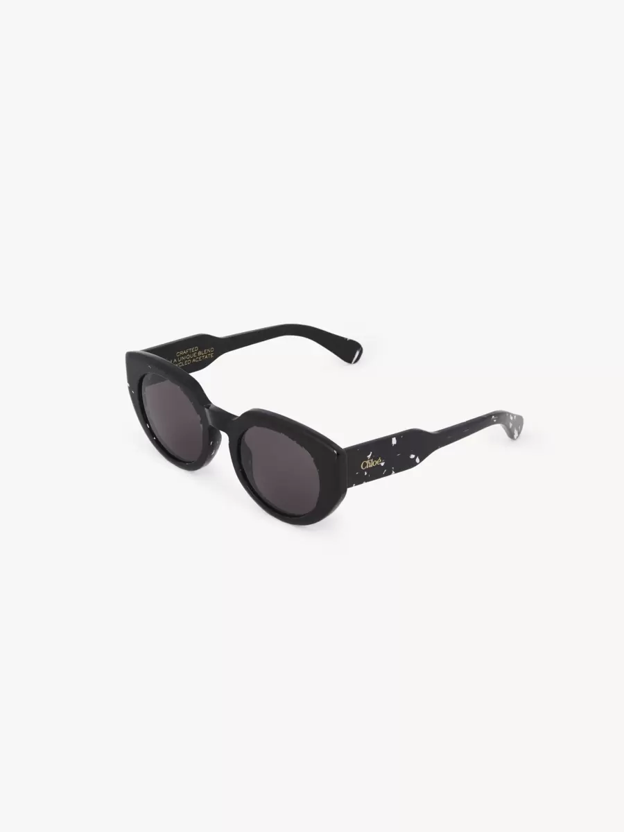 Gayia thick cat-eye sunglasses made of lower-impact pre-consumer recycled acetate and bio-based nylon. Featuring a bold temple shape, the shiny frame is paired with solid gray lenses. A gold-toned Chloé logo signs the left temple.