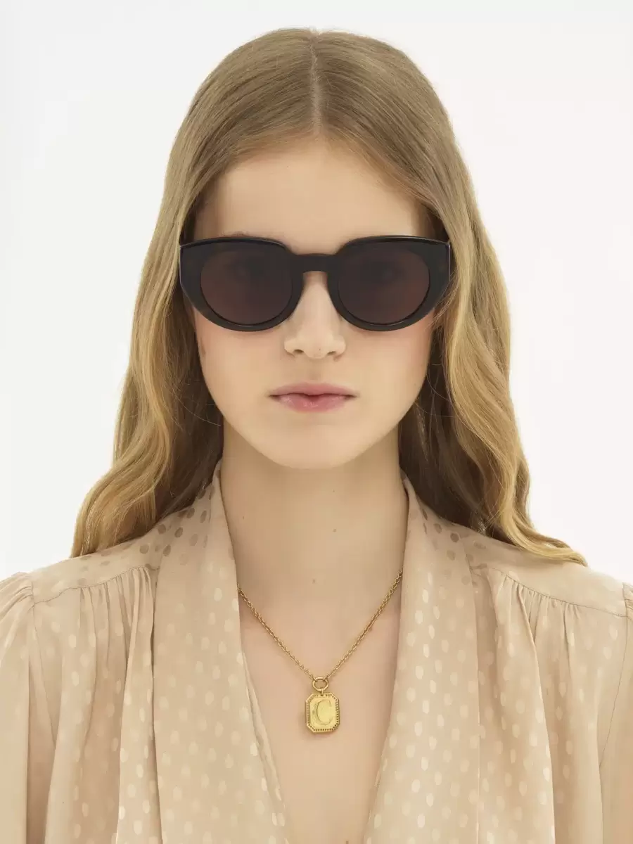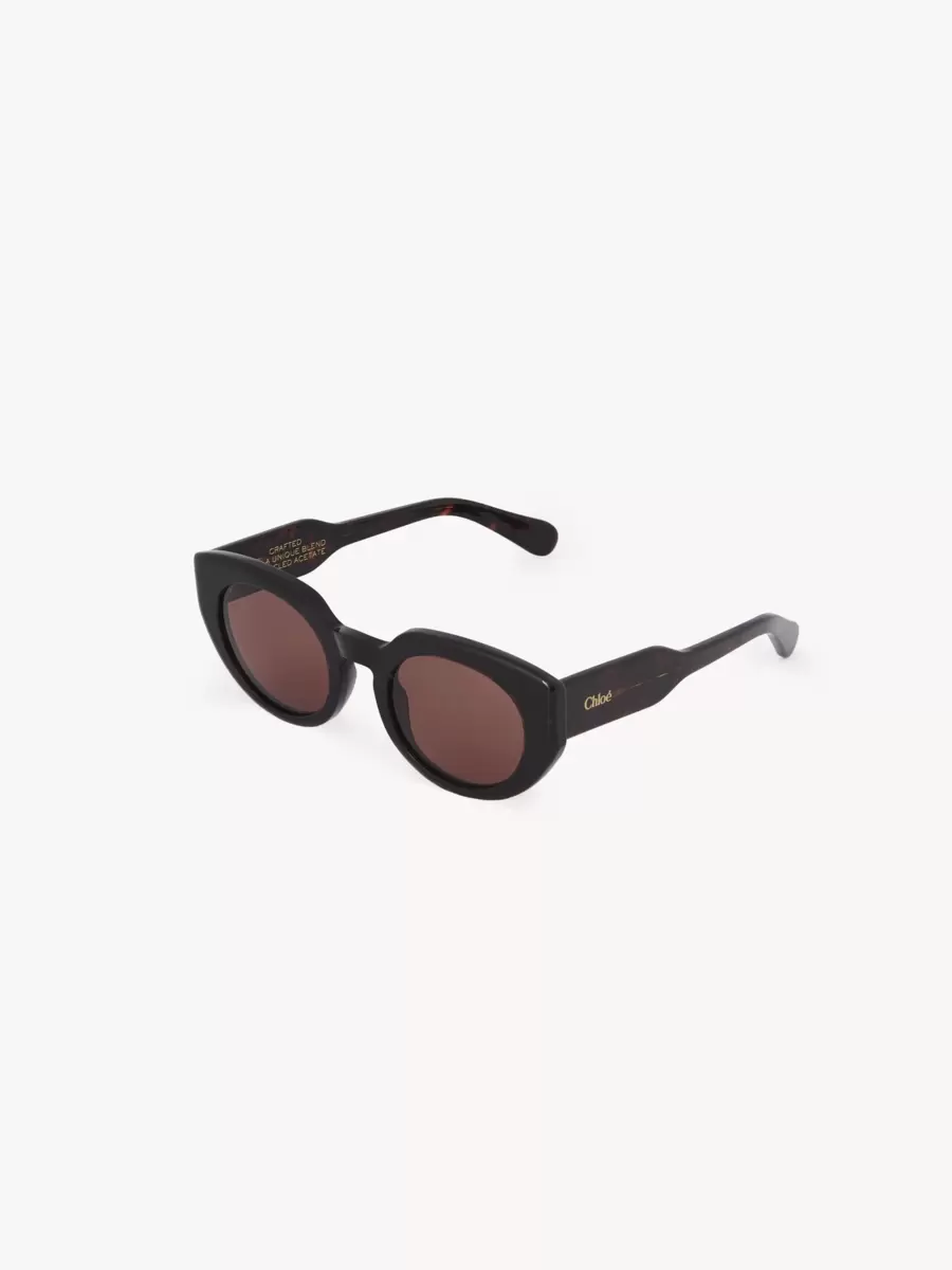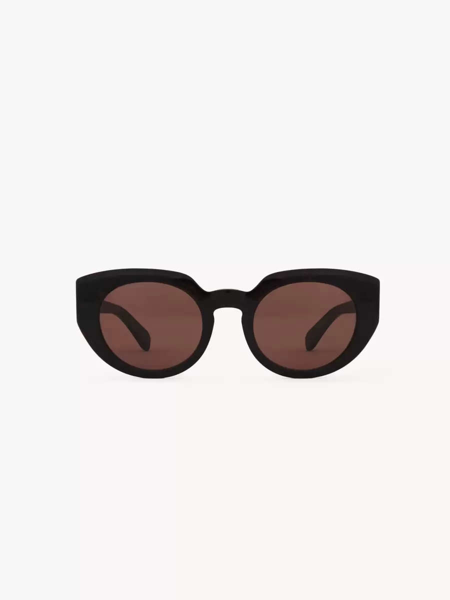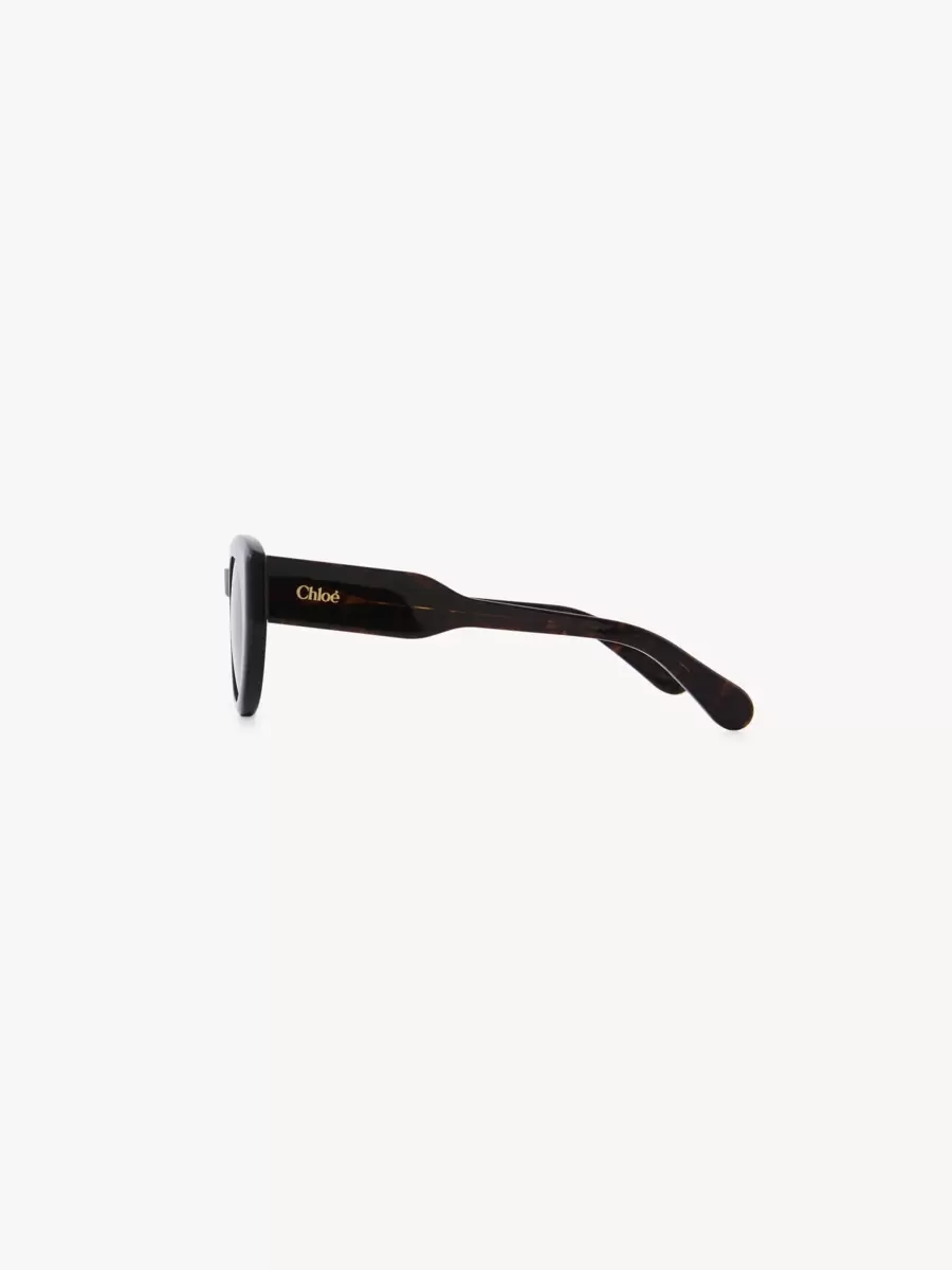 Gayia thick cat-eye sunglasses made of lower-impact pre-consumer recycled acetate and bio-based nylon. Featuring a bold temple shape, the shiny frame is paired with solid chocolate brown lenses. A gold-toned Chloé logo signs the left temple.