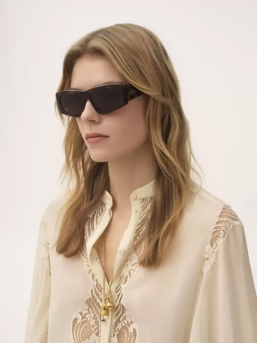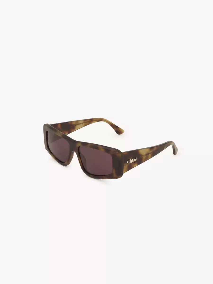 These Izia rectangular sunglasses pair a futuristic Havana beveled frame in thick lower-impact acetate with solid violet lenses. The tapered temples are signed with the gold-tone Chloé logo plate.