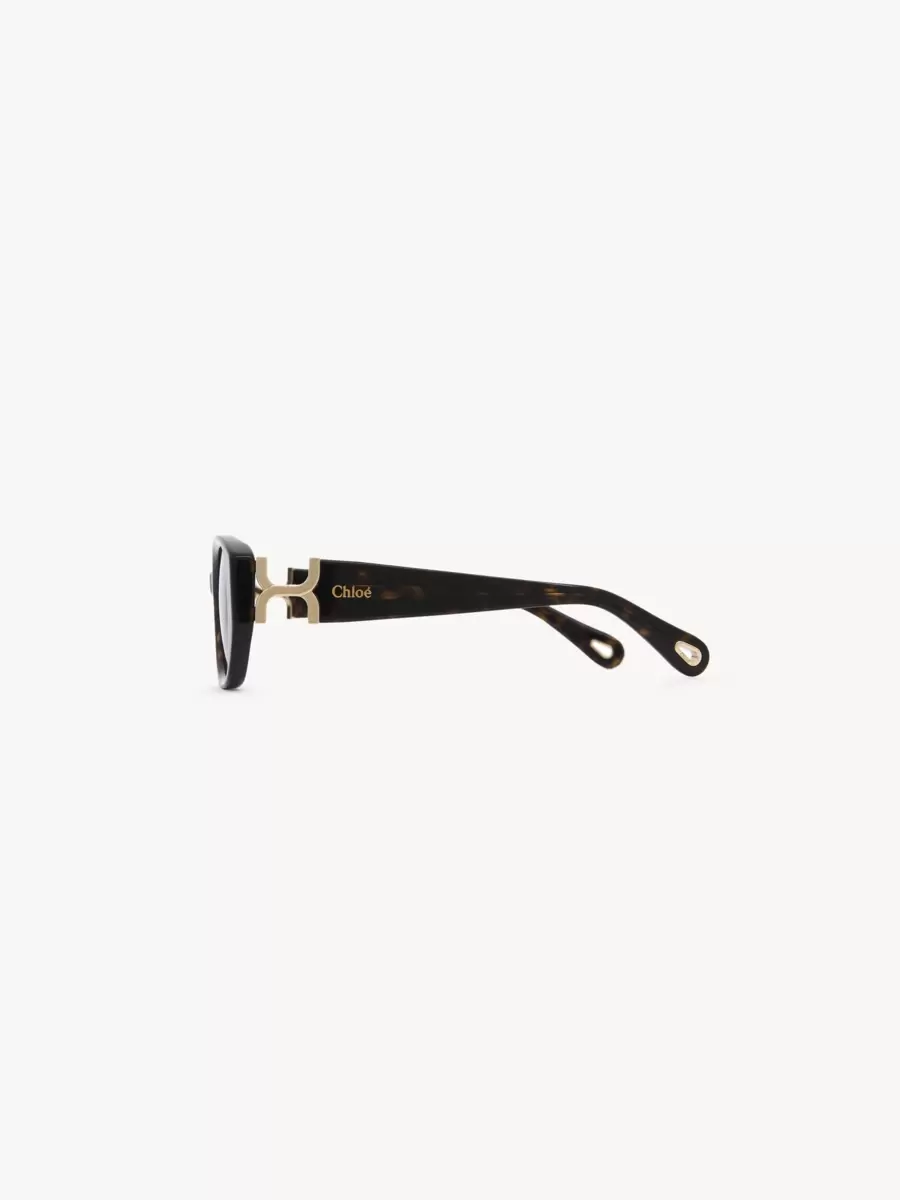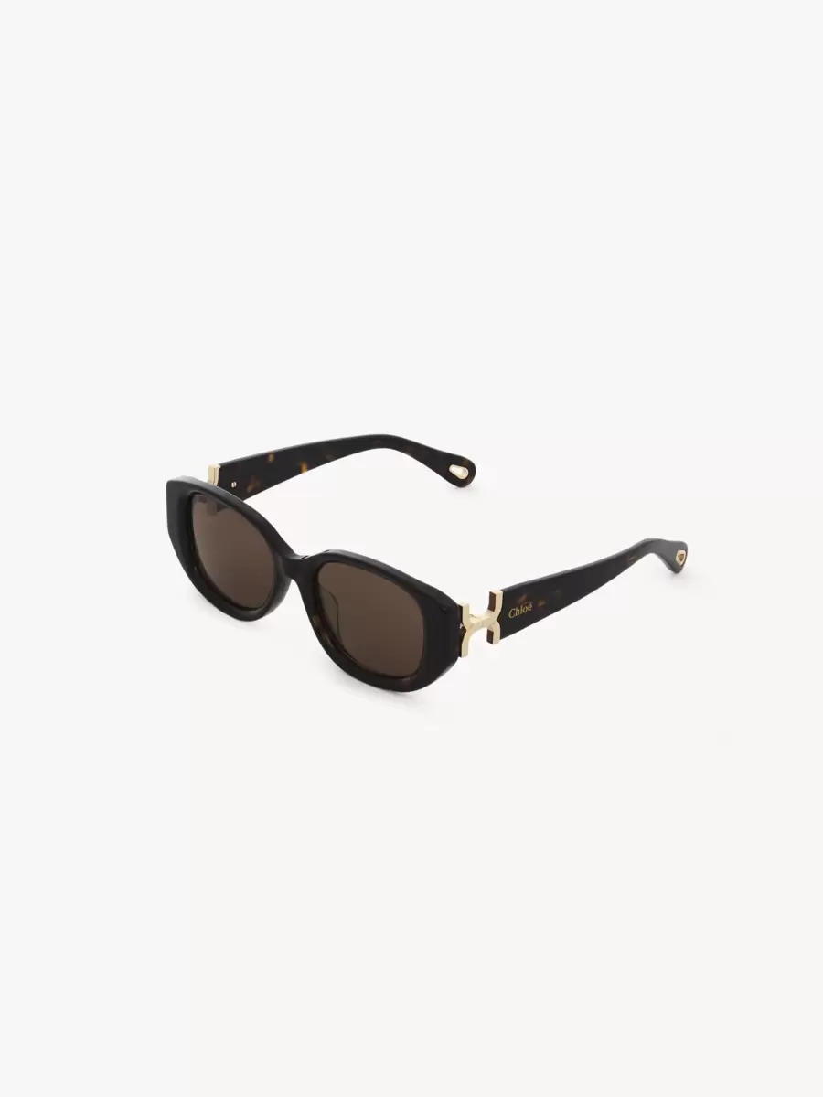 The glossy Dark Havana frame pairs with solid brown lenses in bio-based nylon for a timeless allure. The Chloé logo details the left temple while drop-shaped openings at the temple tips make these women’s sunglasses compatible with Chloé’s eyewear jewelry.