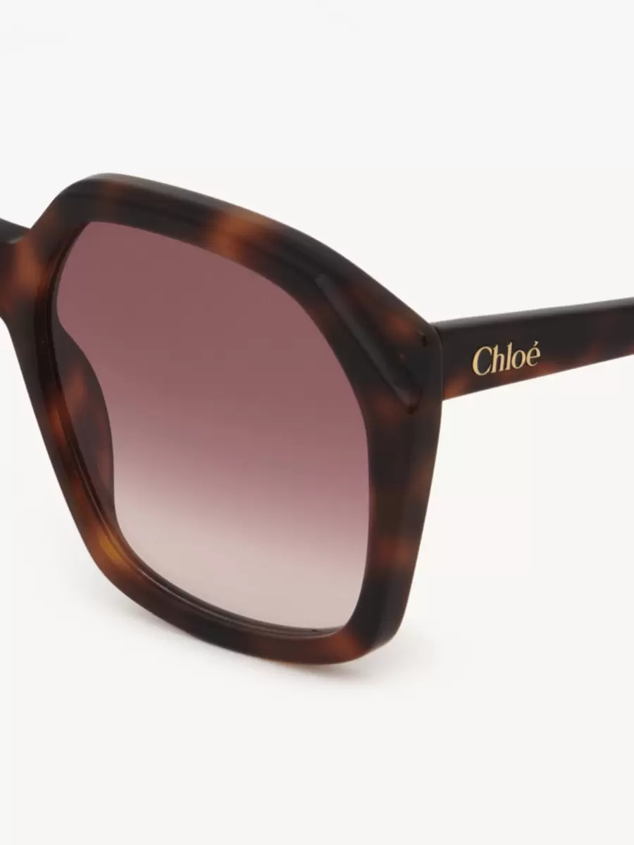 Square Salomé sunglasses with a sharp design and scallop details for a ’70s-inspired aesthetic. Made from lower-impact acetate, the shiny medium Havana frame is paired with gradient Burgundy/crystal lenses in bio-based nylon. A gold-toned Chloé logo plate signs both temples.