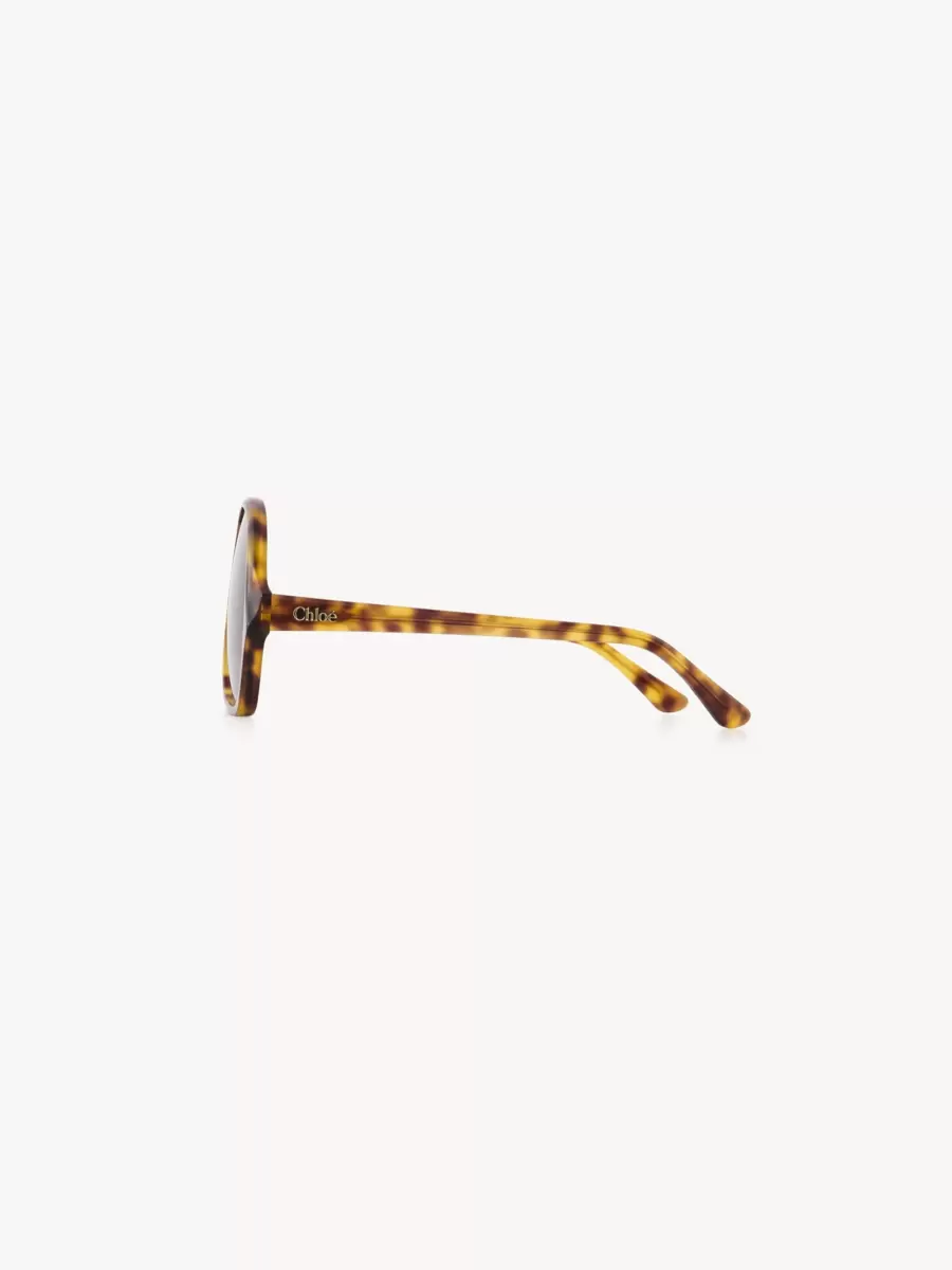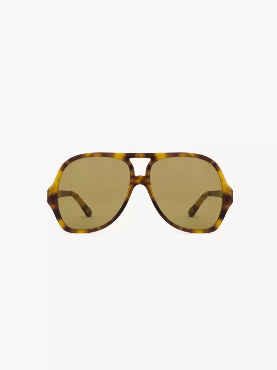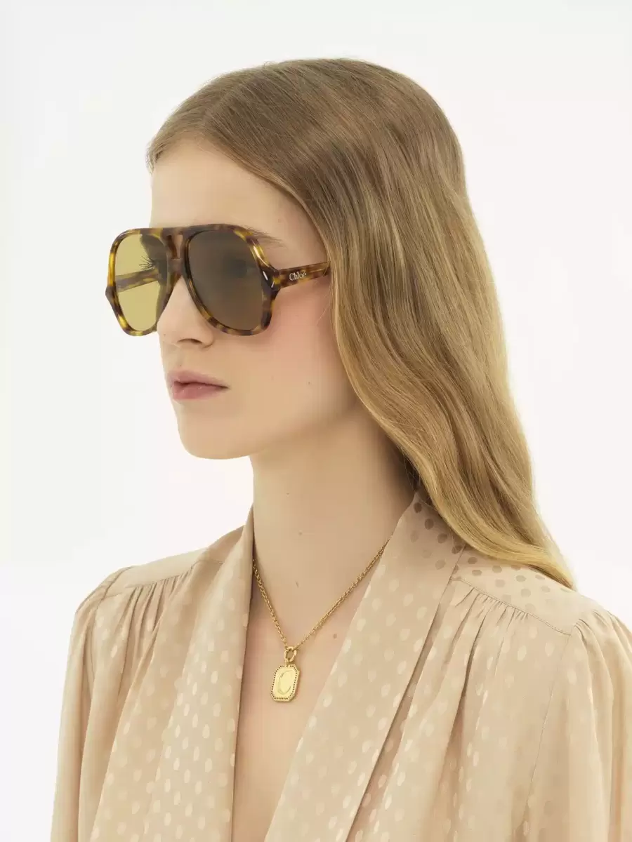 The Salomé aviator sunglasses feature a shiny Havana frame in lower-impact acetate with scalloped detailing and low temples signed with the Chloé logo. Solid khaki lenses finish these 70s-style sunglasses.
