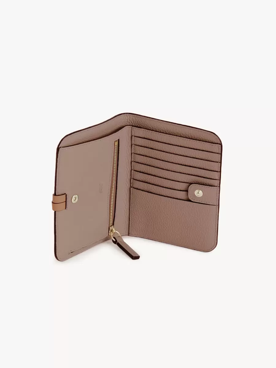The Maison’s iconic Alphabet line includes this bifold wallet in grained and shiny calfskin, featuring a zipped compartment and multiple card slots.