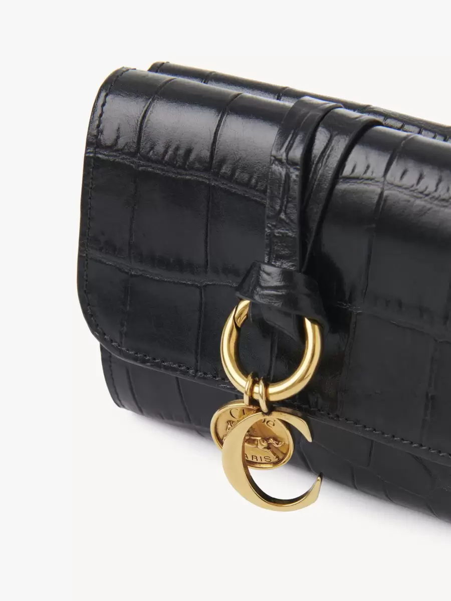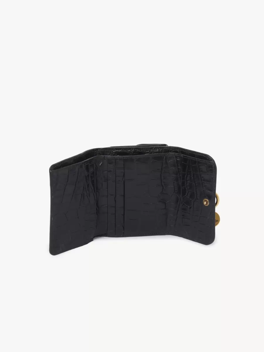 The Maison’s iconic Alphabet line includes this small tri-fold wallet in croco-effect calfskin. Designed to hold the essentials, it features multiple card slots and one flat pocket. The front is finished with a knotted link and Chloé’s signature golden initial and Horse Medal charms.