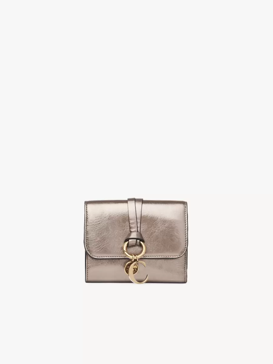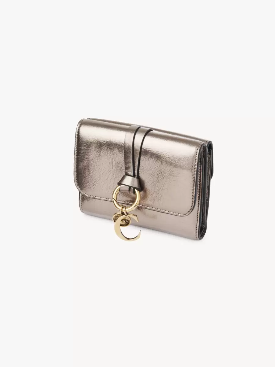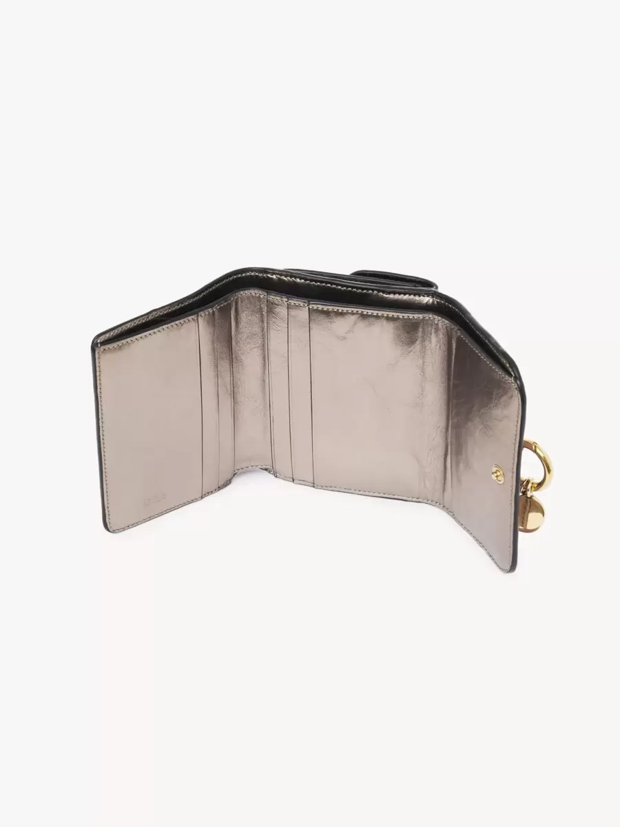 The Maison’s iconic Alphabet line includes this small tri-fold wallet in metallized calfskin. Designed to hold the essentials, it features multiple card slots and one flat pocket. The front is finished with a knotted link and Chloé’s signature golden initial and Horse Medal charms.