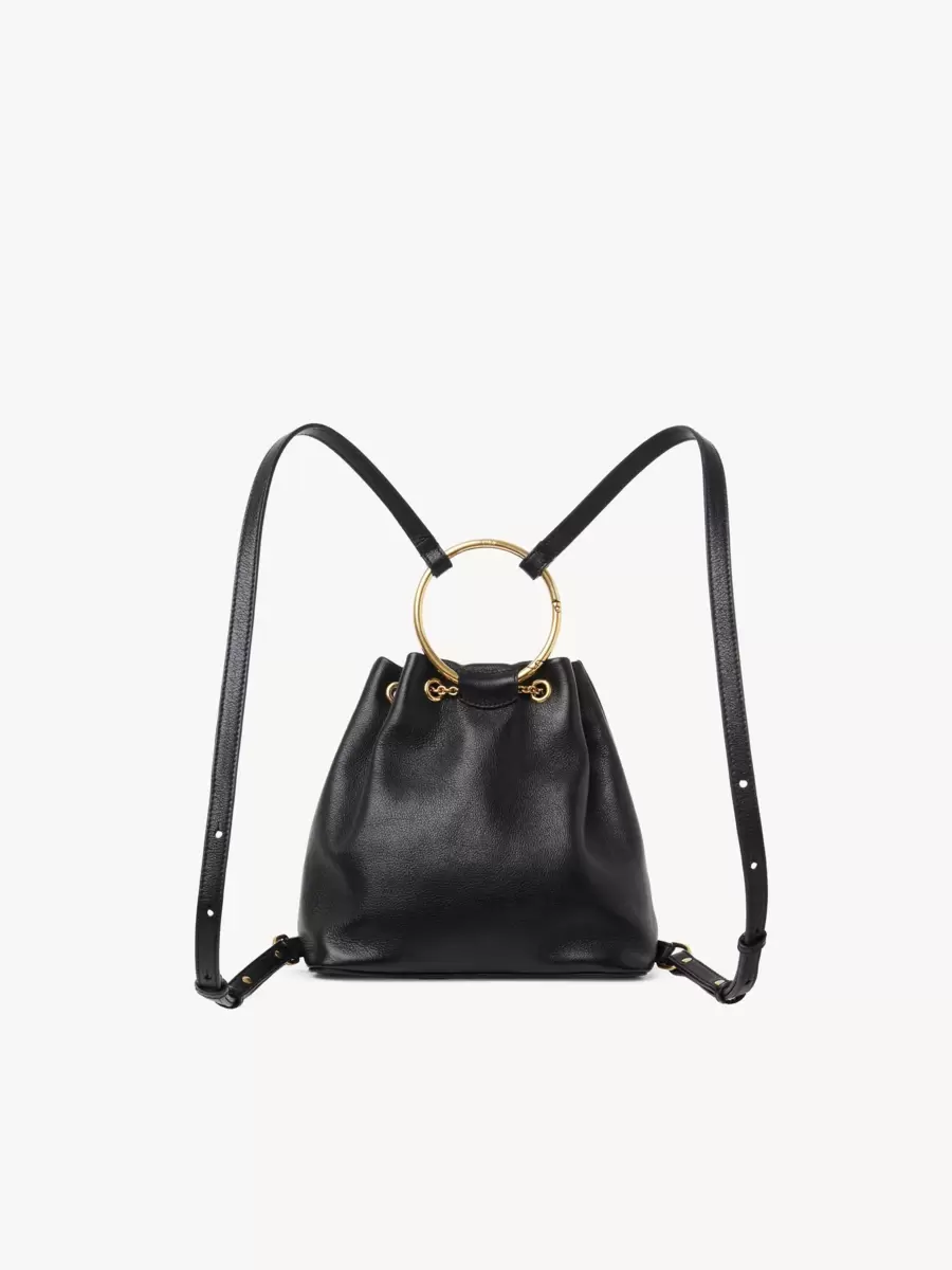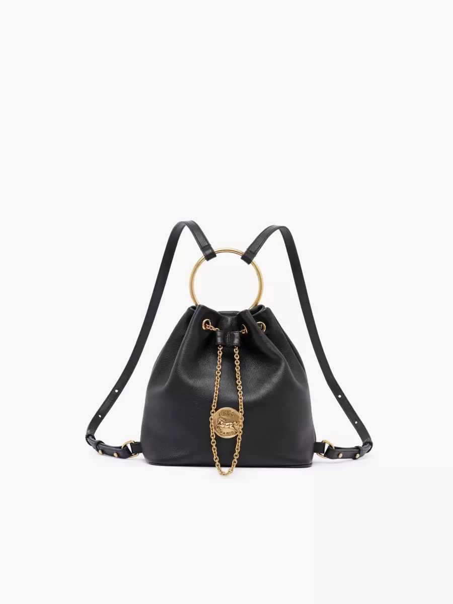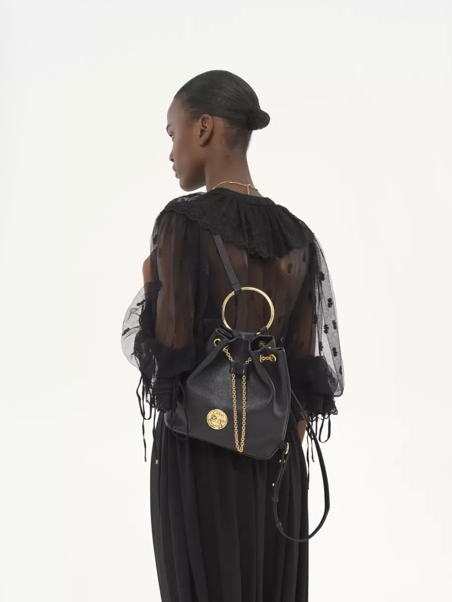The small Bracelet backpack is crafted from grained buffalo leather. The supple silhouette is embellished with an oversized bracelet handle, a drawstring chain and the Maison’s signature Horse Medal.
