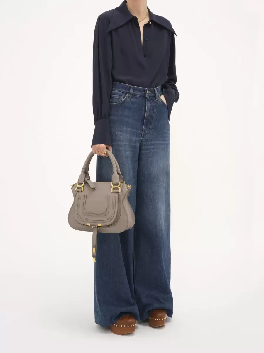 A more compact version of the iconic Marcie purse, this small bag is crafted from grained calfskin. Clean lines and a contoured design enhance the slouchy silhouette, while hand-wrapped leather handles add crafty detail. The X-shaped buckles lend a refined finish. Double handles and a long, removable shoulder strap make this small double carry bag a truly versatile accessory.