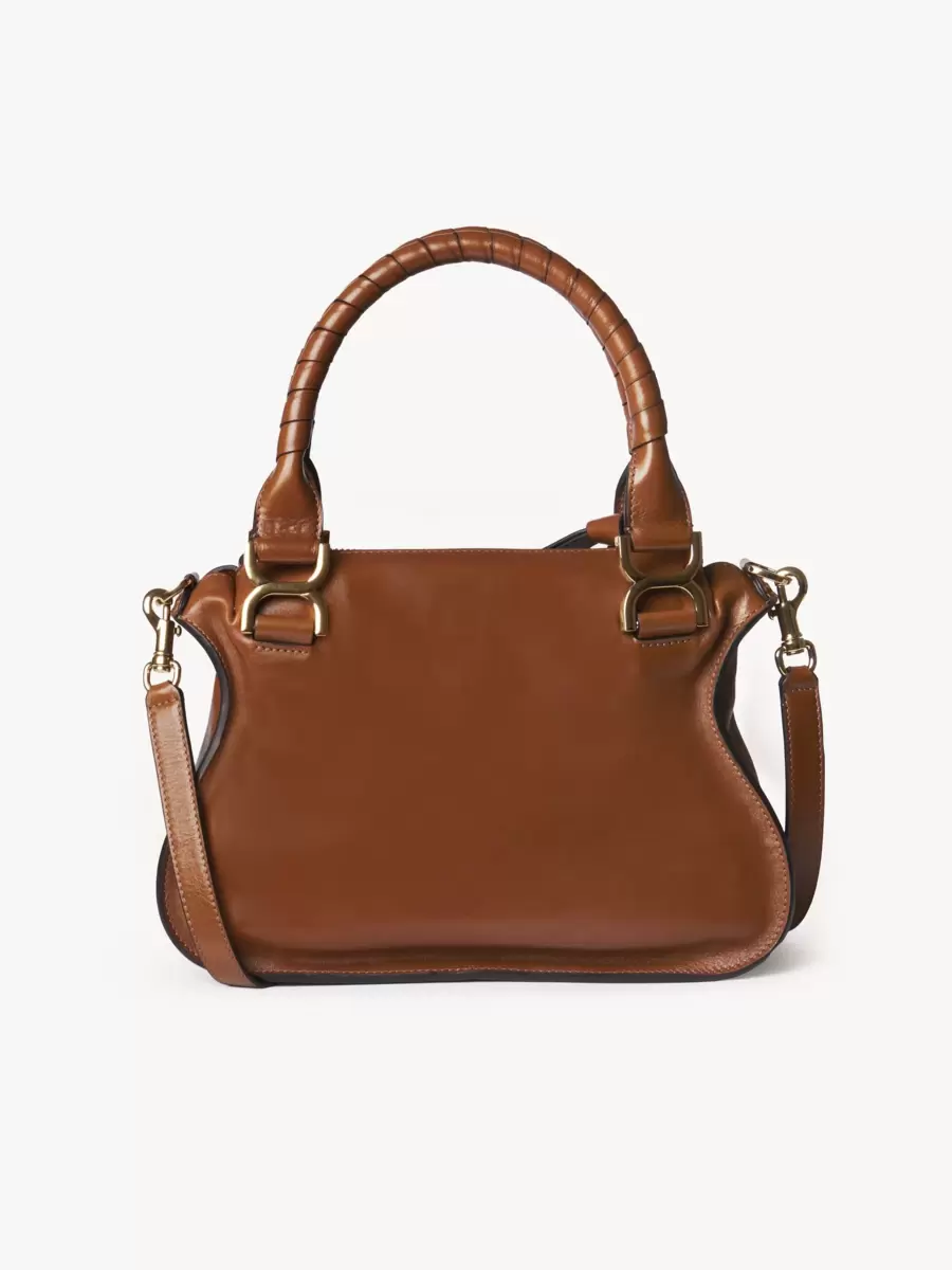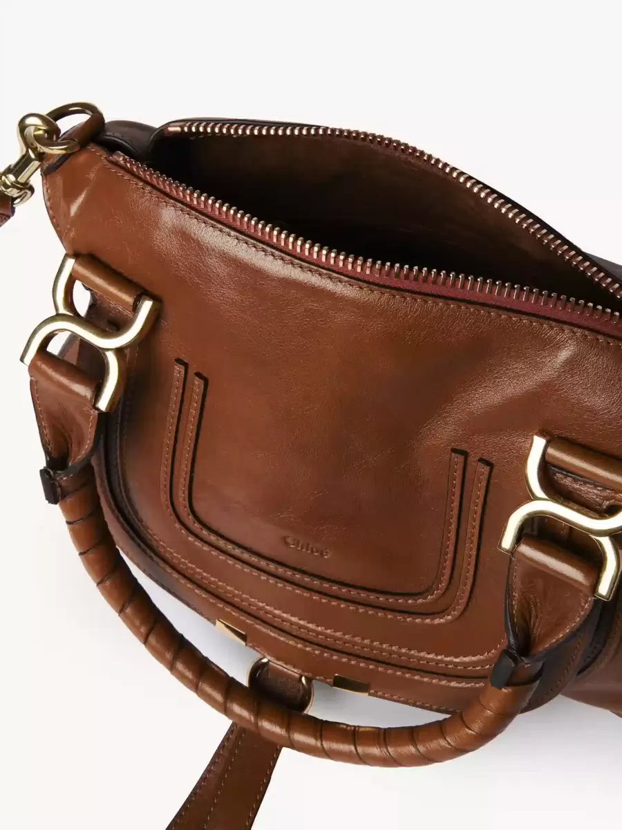 Crafted from shiny calfskin, this small Marcie purse has a slouchy silhouette with feminine lines. It is finished with saddle stitching, iconic gold-tone buckles and hand-wrapped double handles. The line’s leather tassels secure the flap.