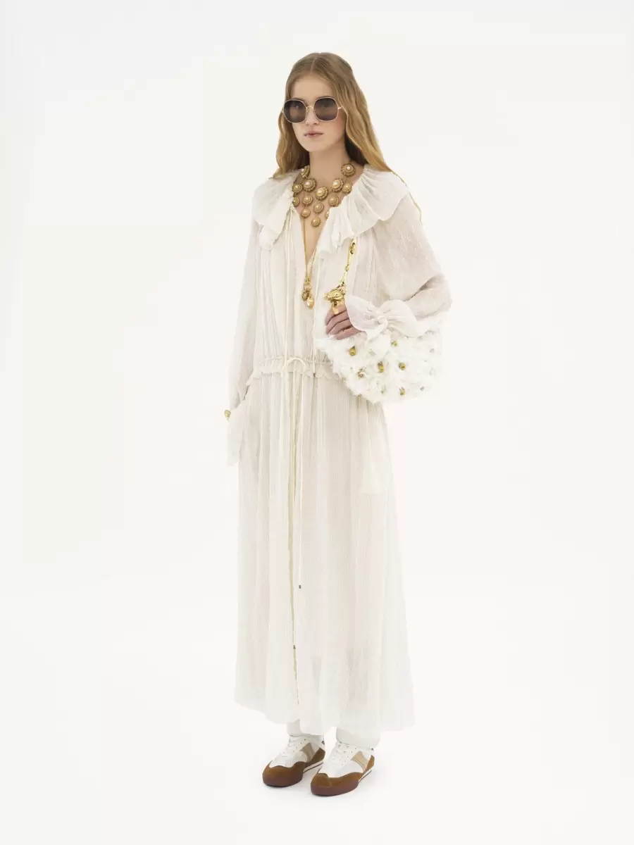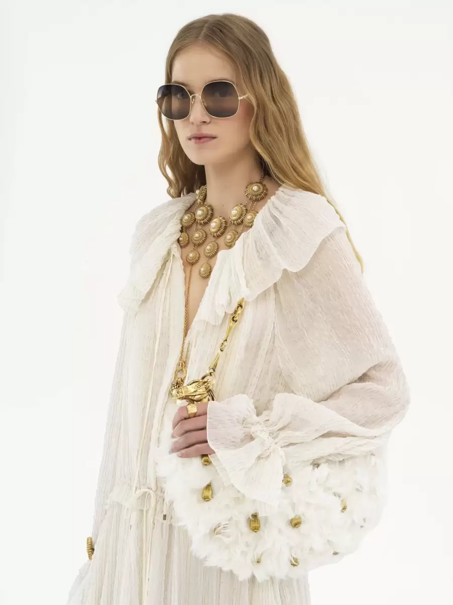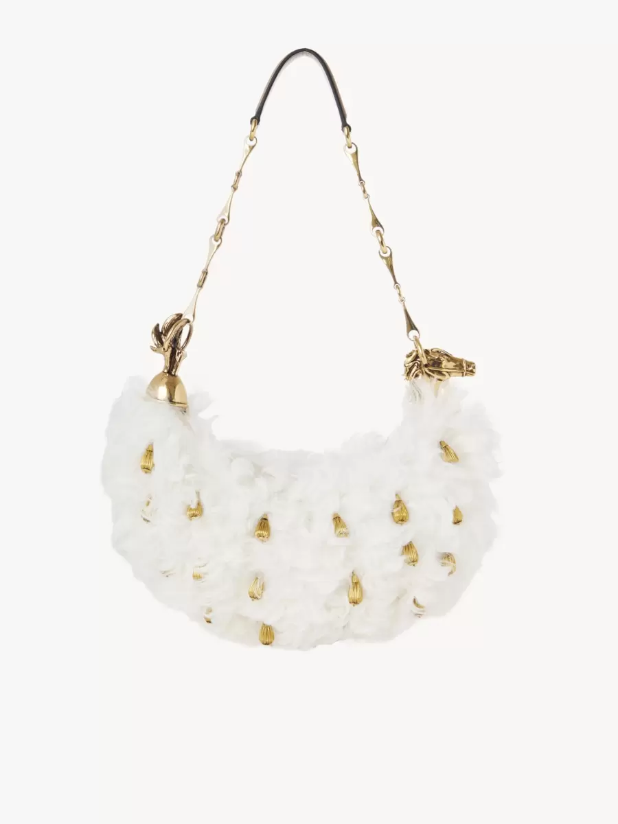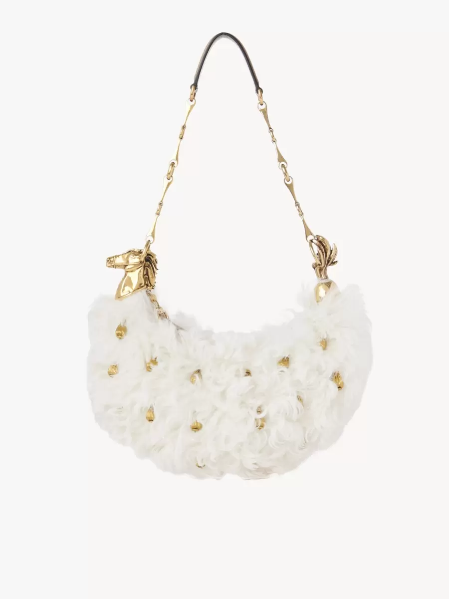 This Chain Horse shoulder bag is crafted from shearling in a minimalist silhouette elevated by intricate hand-embroidered golden beads. Inspired by the equestrian world, it is finished with the line’s gold-tone horse and a horsebit chain.