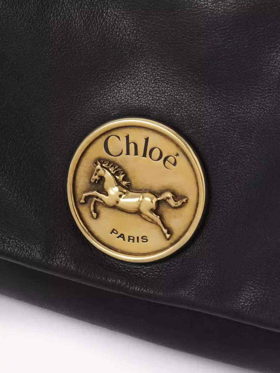 Crafted from grained buffalo leather, this Chloé Heritage shoulder bag is inspired by the Maison’s codes. The supple, curved construction is embellished with gold-tone hardware, combining a signature Horse Medal closure with dangling charms.