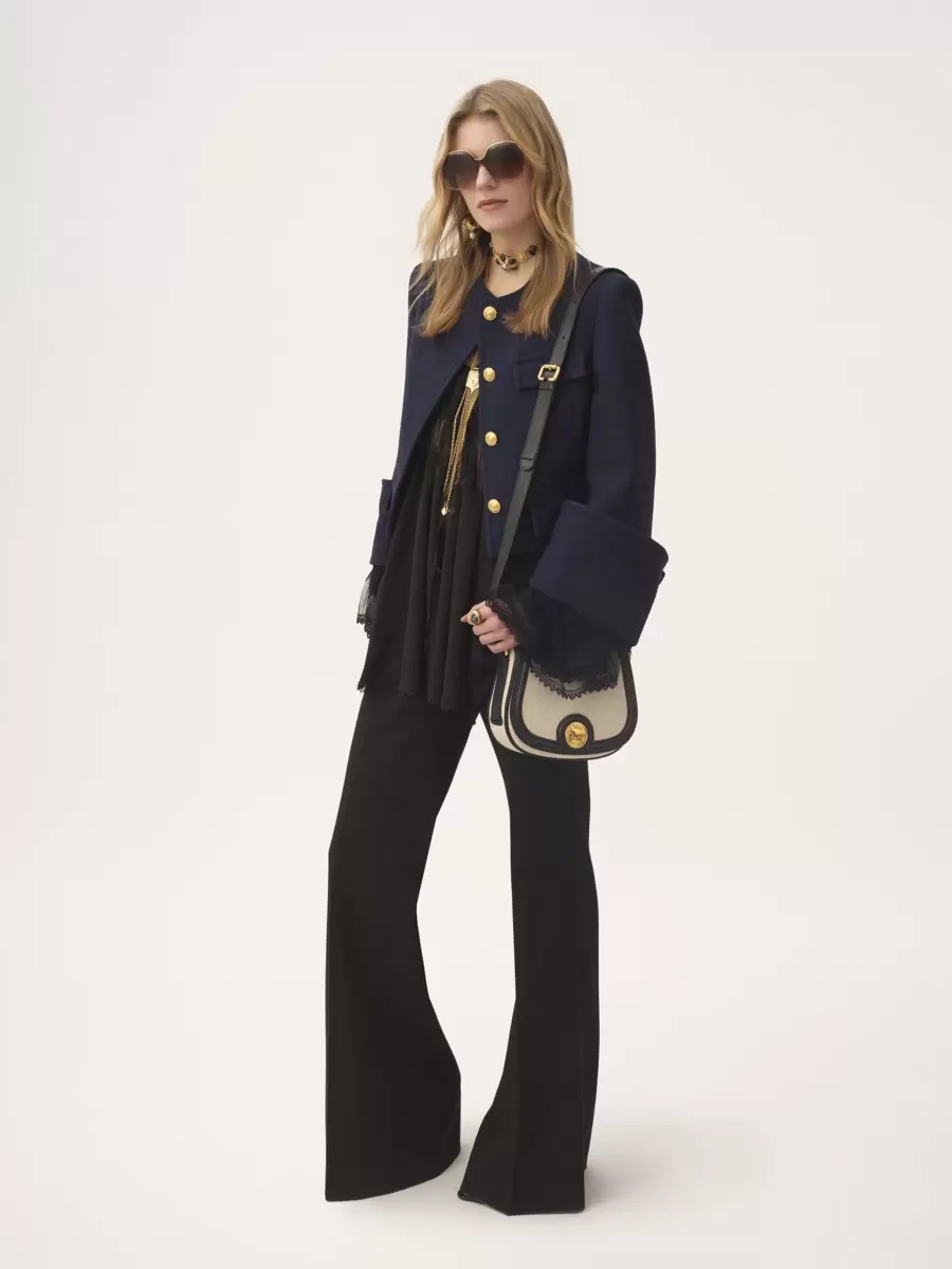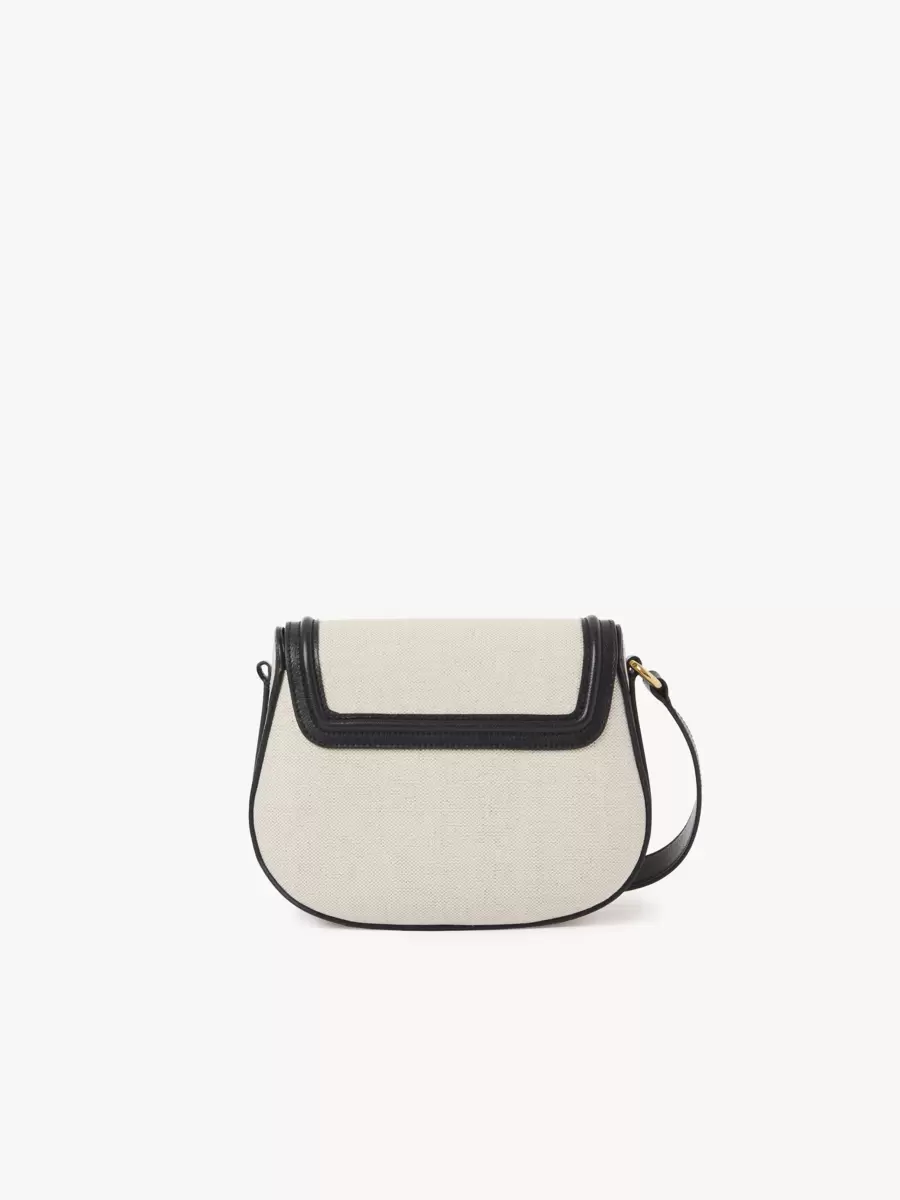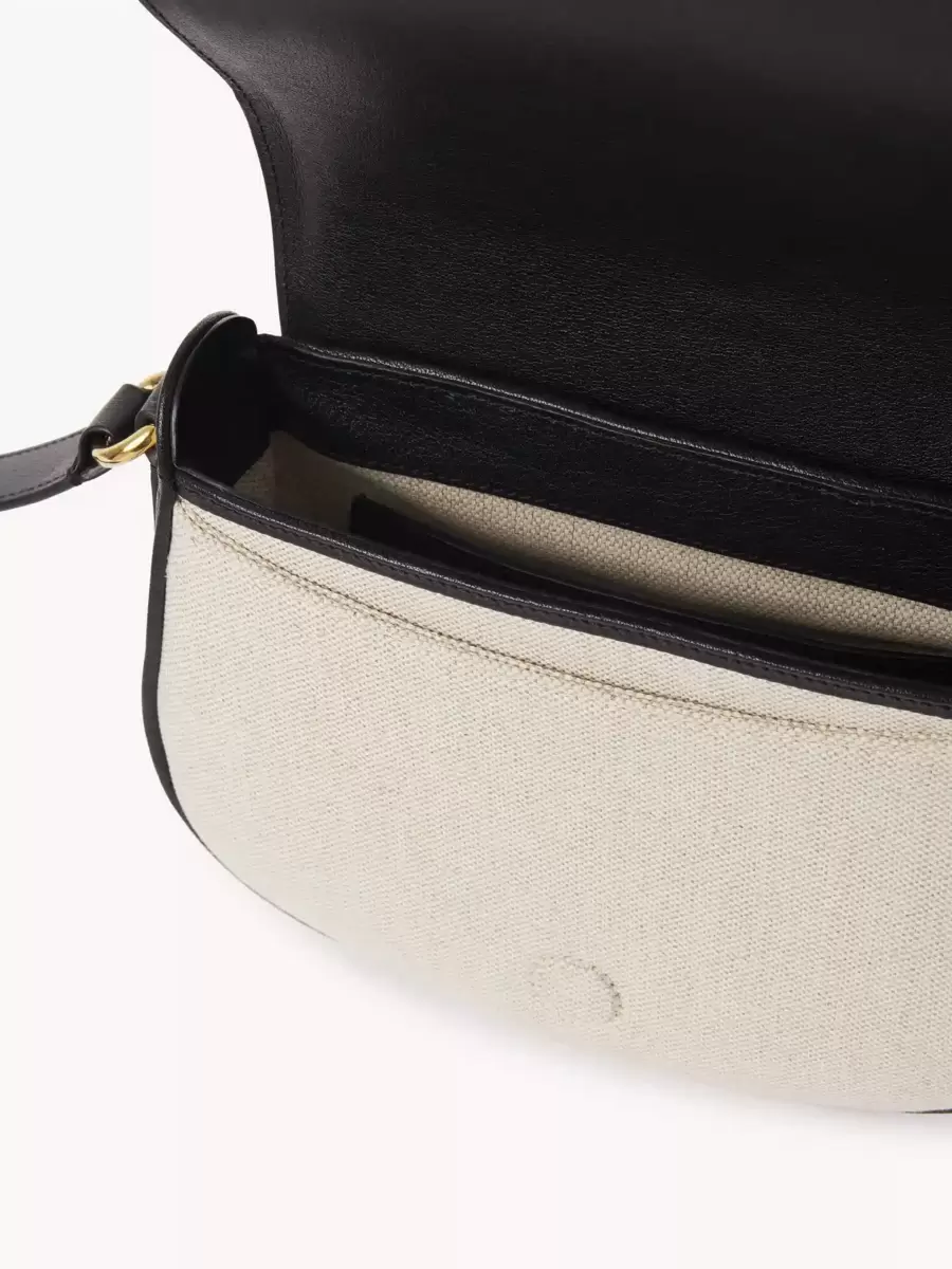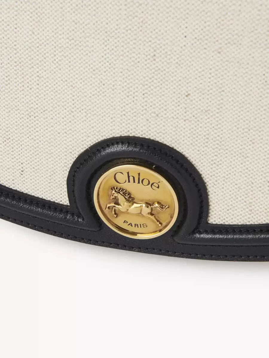 This Horse Medal saddle bag is crafted from a mix of cotton canvas and grained buffalo leather. The rounded compartment is signed with the Maison’s iconic gold-tone medal featuring an embossed image of a galloping horse and a Chloé Paris logo engraving.