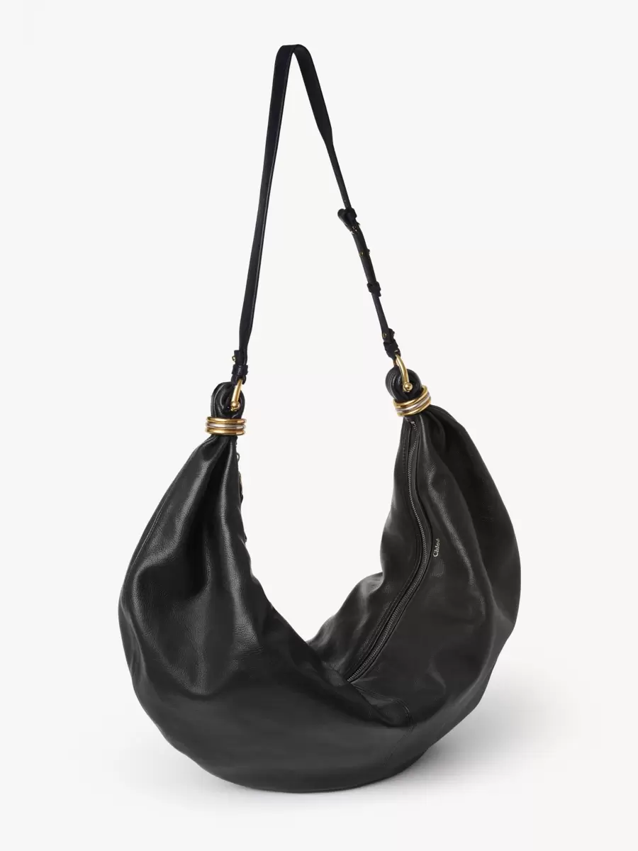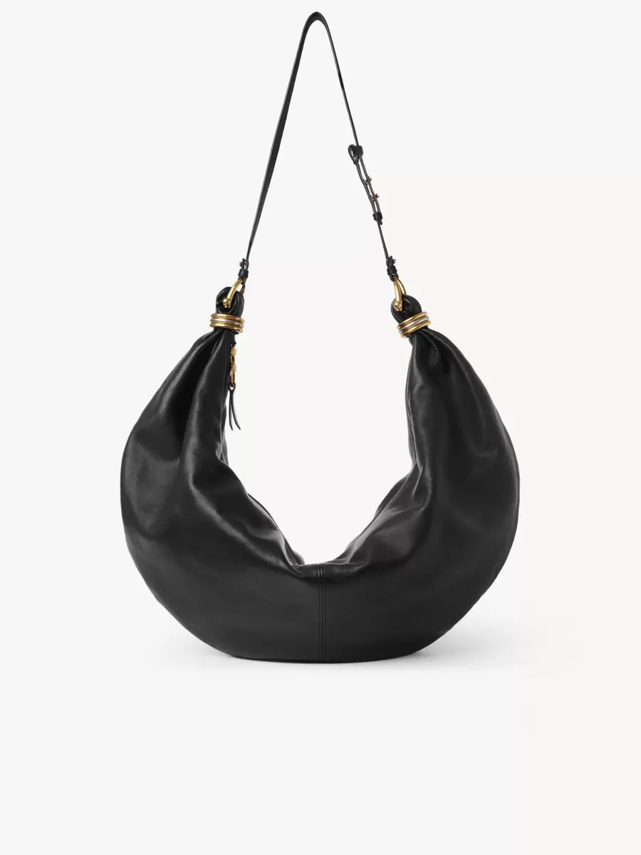 Inspired by the Maison’s Archives, this oversized Bracelet Hobo bag is crafted from shiny grained calfskin. The supple, rounded shape is elevated by stacked two-toned rings at the ends.