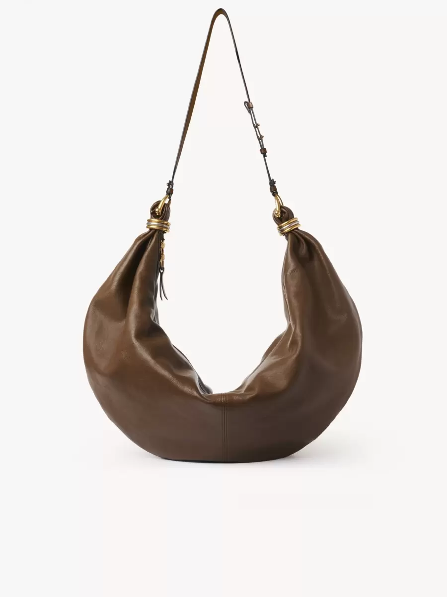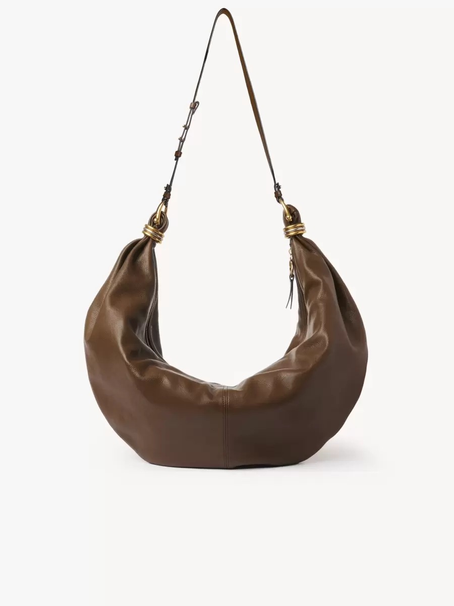 Inspired by the Maison’s Archives, this oversized Bracelet Hobo bag is crafted from shiny grained calfskin. The supple, rounded shape is elevated by stacked two-toned rings at the ends.