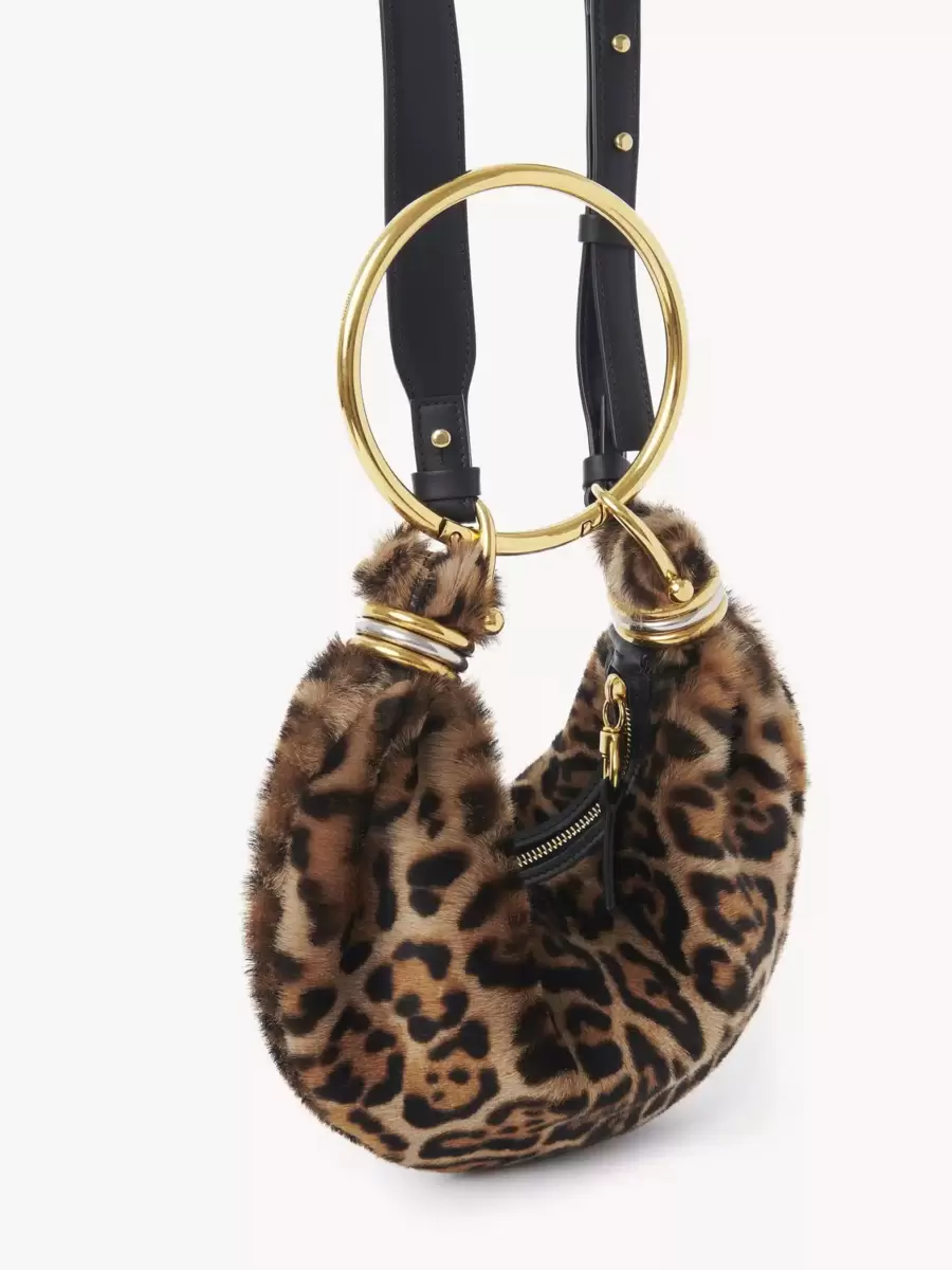 Inspired by the Maison’s Archives, this mini Bracelet Hobo bag is crafted from leopard-print shearling. The supple, rounded shape is elevated by a bracelet handle and stacked bi-color rings at the ends.