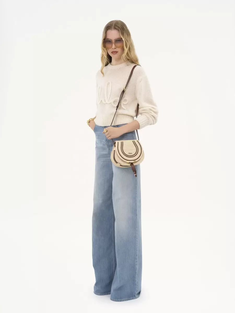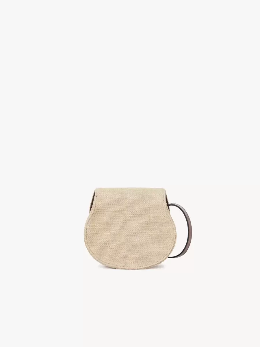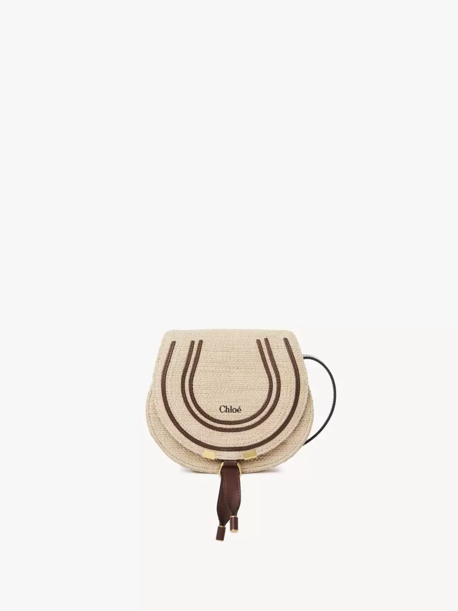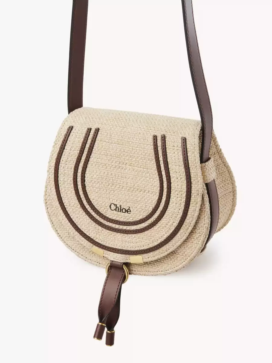 This small Marcie saddle bag is crafted from raffia-effect fibers with a rounded silhouette and a clean top line. The flap features calfskin embellishment and the line’s iconic saddle stitching, secured with signature dangling leather tassels.