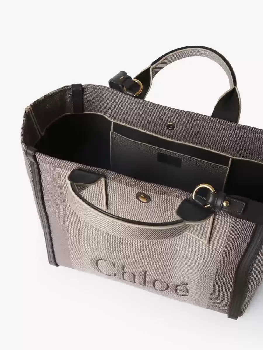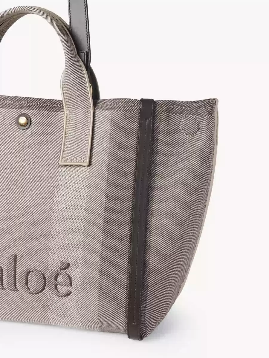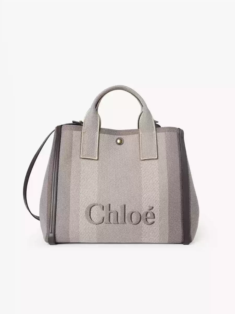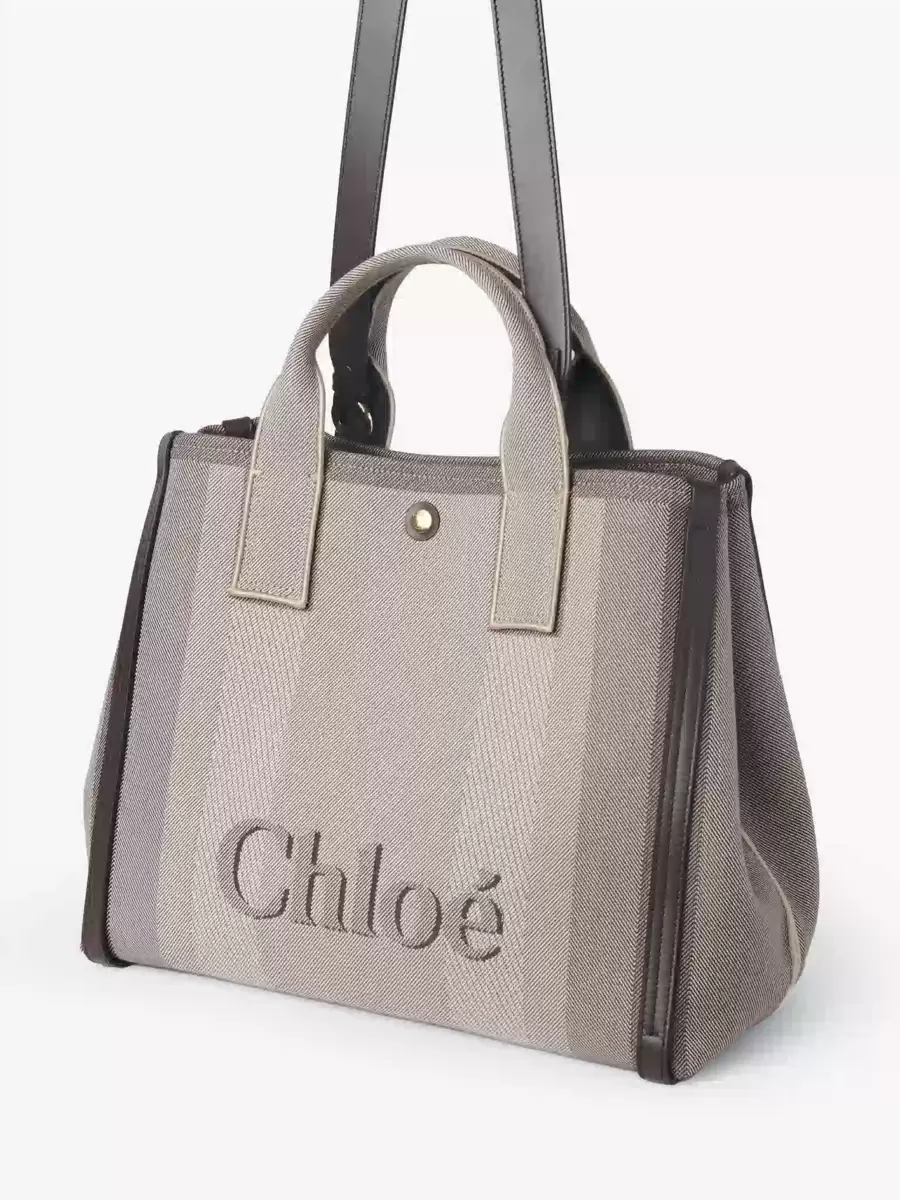 The Chloé Carry tote bag is crafted from striped cotton canvas jacquard complemented by contrasting vertical leather bands and an oversized Chloé logo.