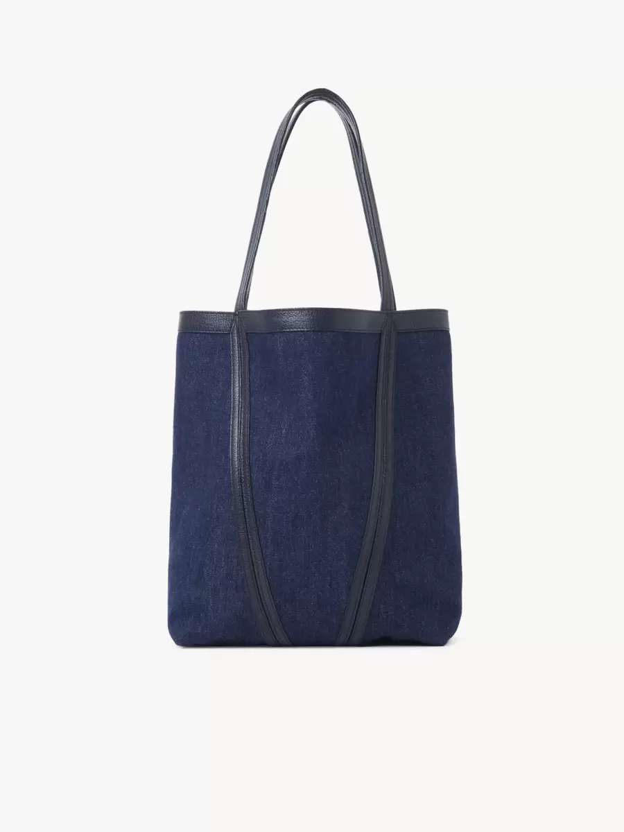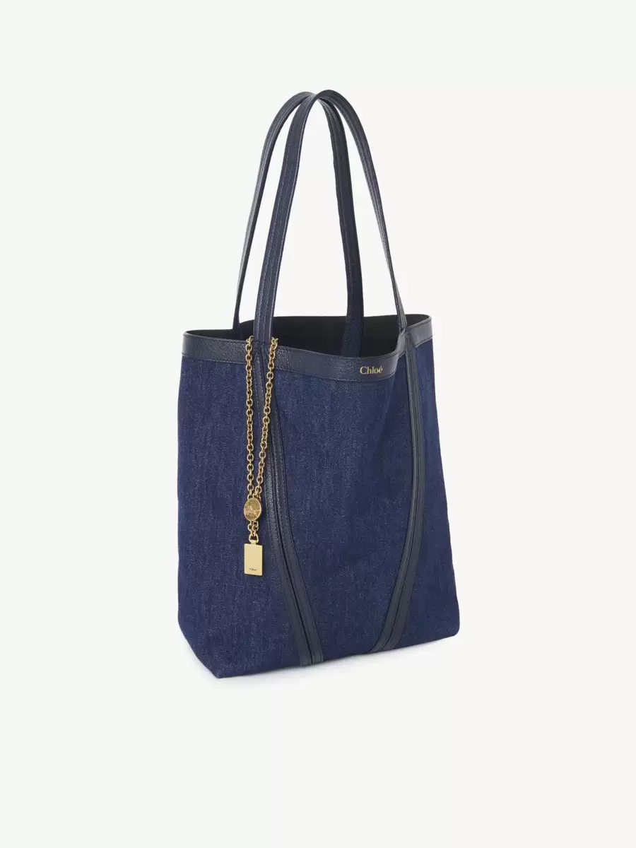 Crafted from denim and cowhide, the Chloé Spin tote bag has a minimalist silhouette elevated with graphic lines. A dangling chain features the Maison’s signature Chloé and Horse Medals.