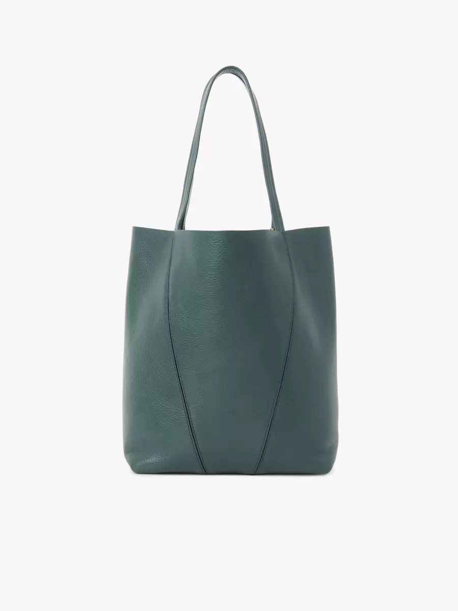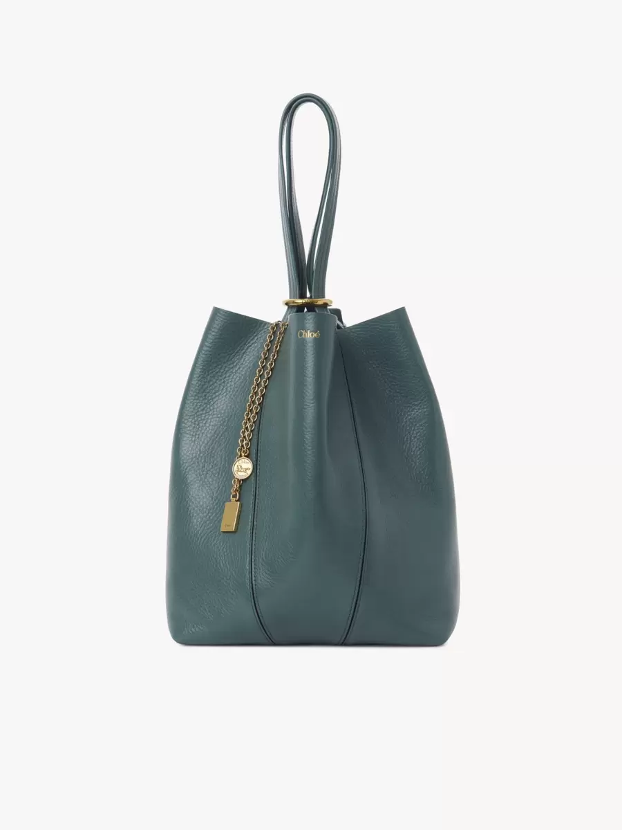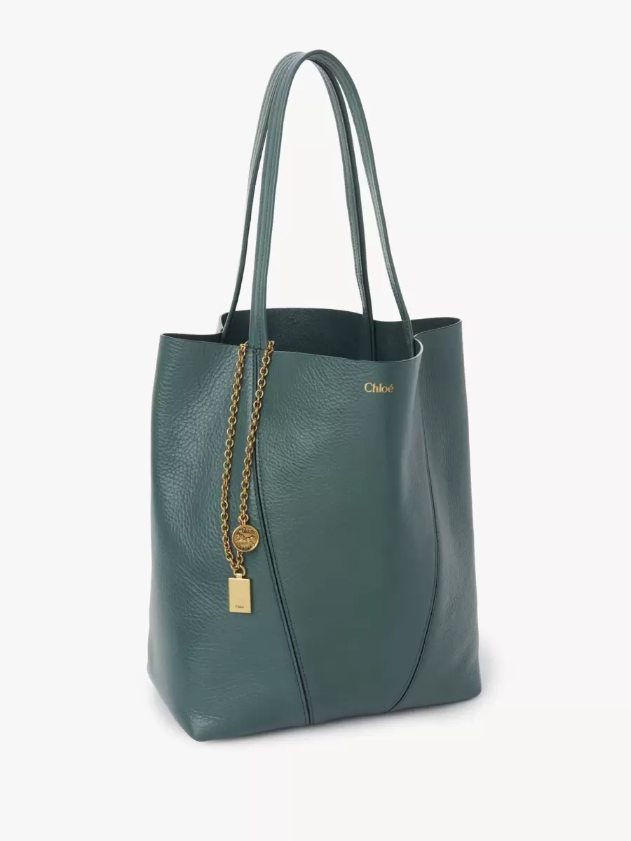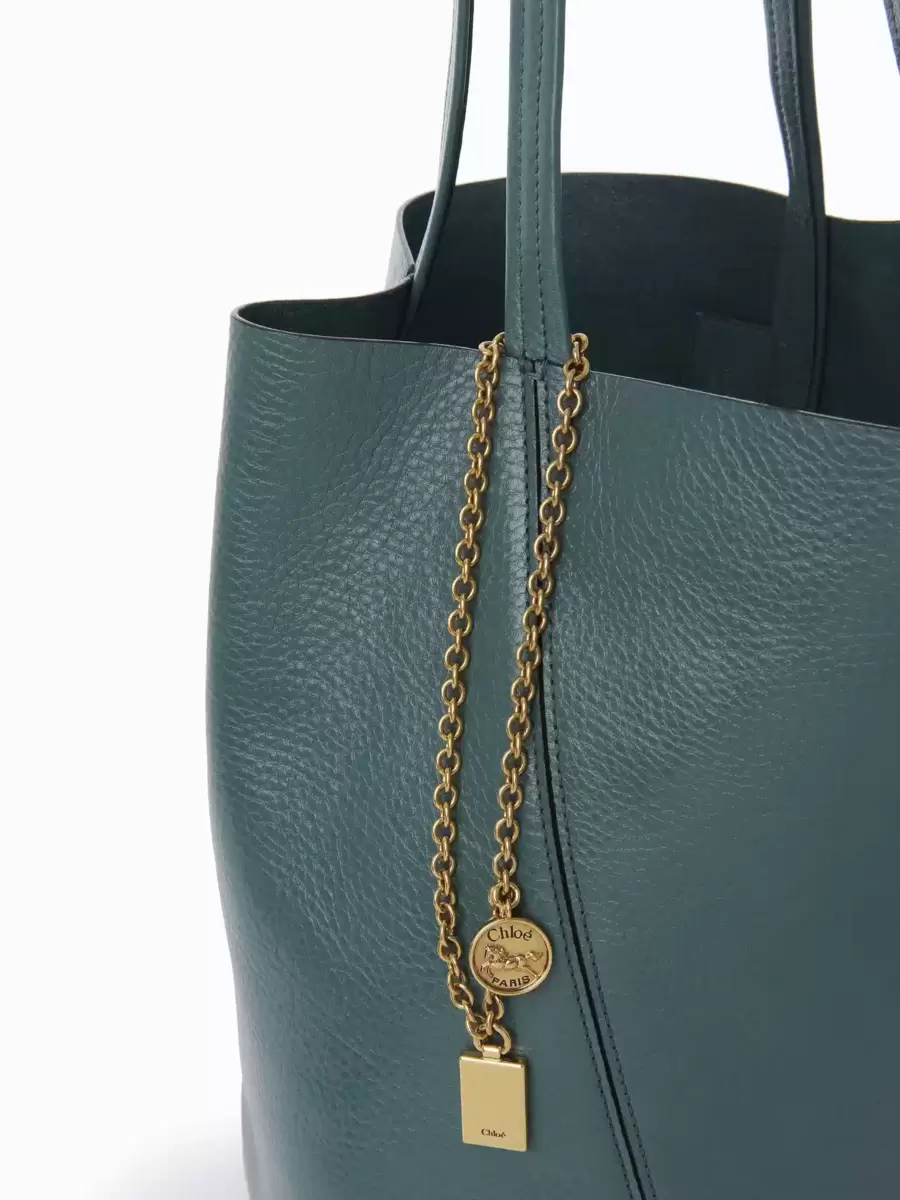 Crafted from shiny grained cowhide, the Chloé Spin tote bag has a minimalist silhouette elevated with graphic lines. A dangling chain features the Maison’s signature Chloé and Horse Medals.