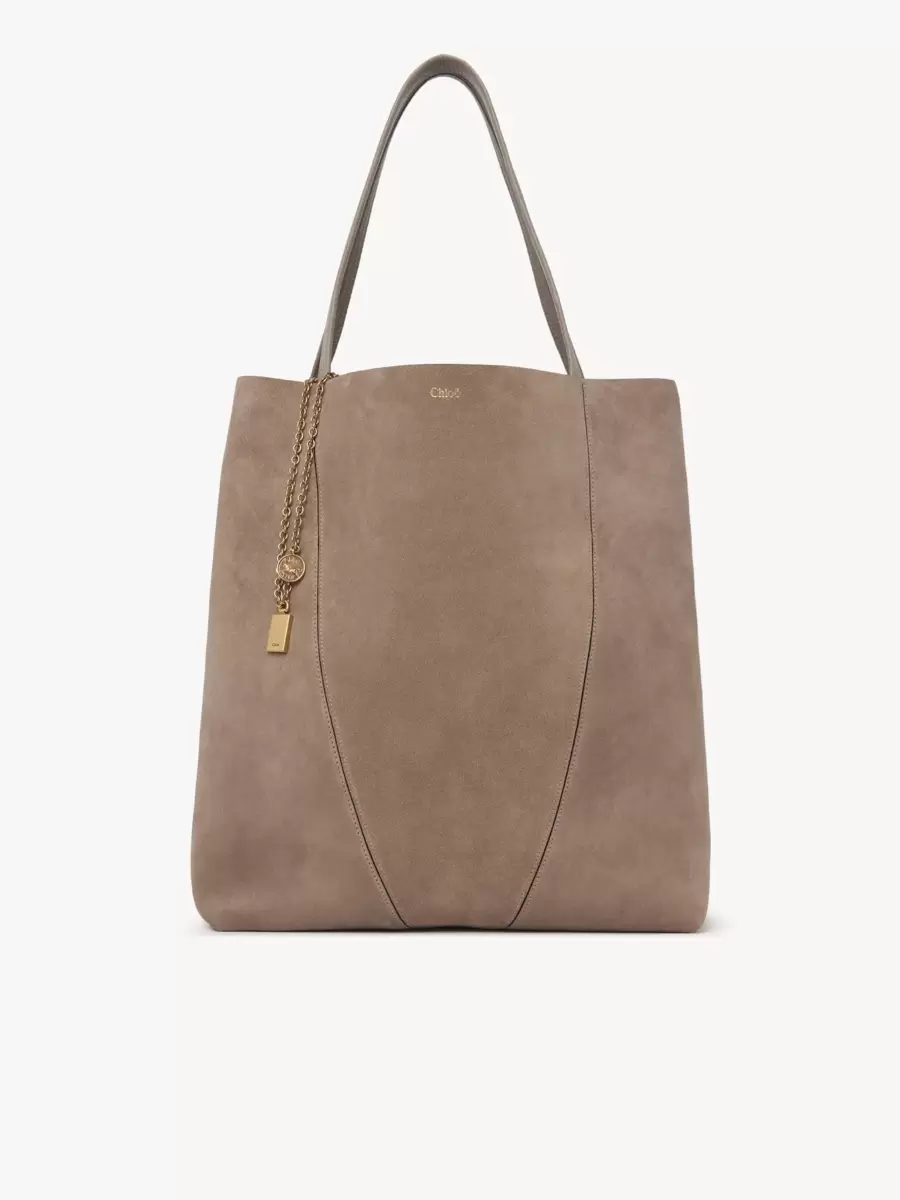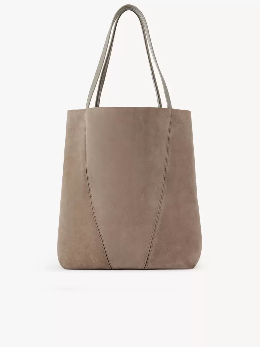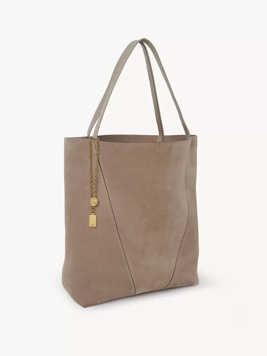Crafted from suede calfskin, the large Chloé Spin tote bag has a minimalist silhouette elevated with graphic lines. A dangling chain features the Maison’s signature Chloé and Horse Medals.