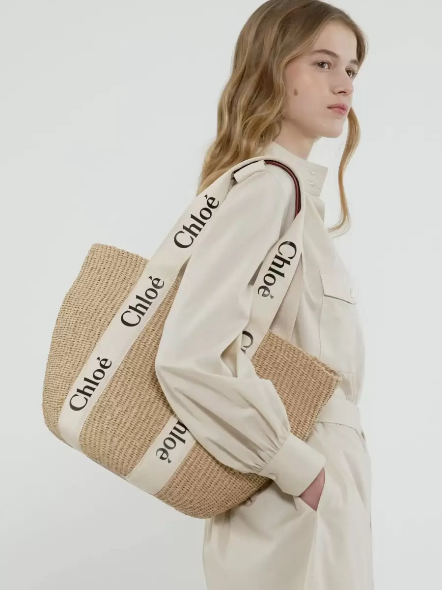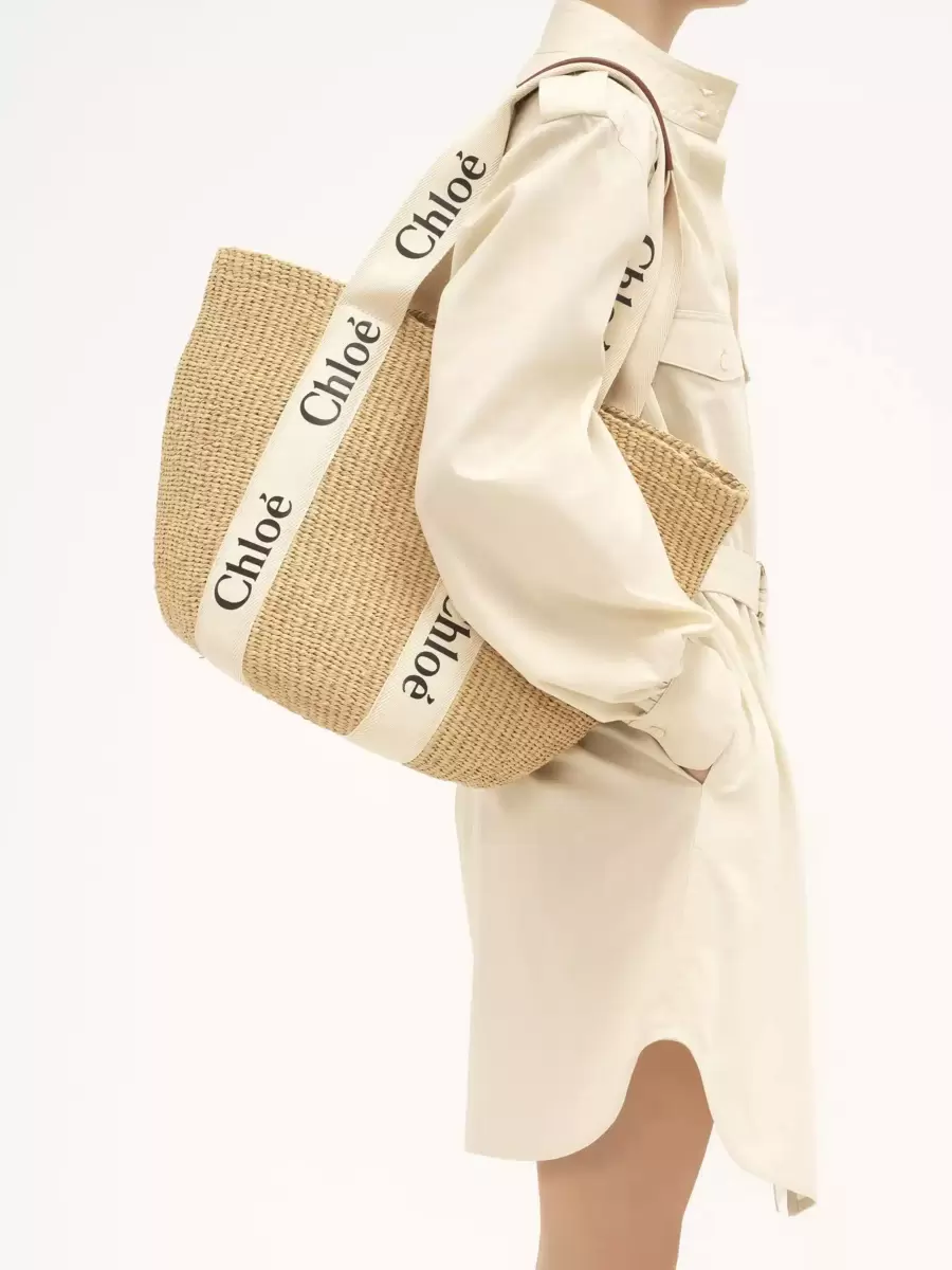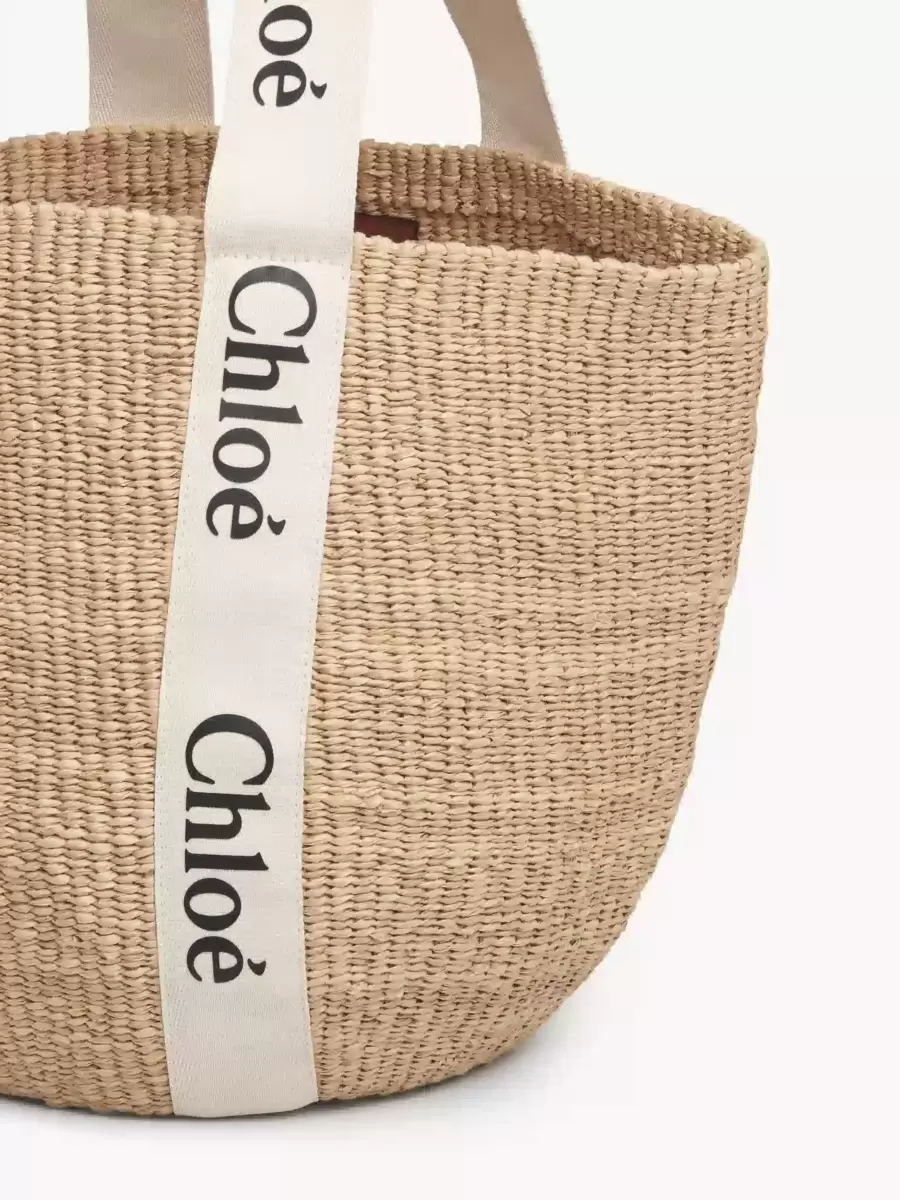 Crafted in a timeless basket shape for an effortless summer mood, this large Woody basket is handwoven by independent craftswomen in Kenya. Echoing the Maison’s Woody mule, the line’s Chloé logo ribbon details the natural fiber for graphic contrast and a signature touch. The bottom of the basket is protected by a Chloé-embossed round leather patch for durability.