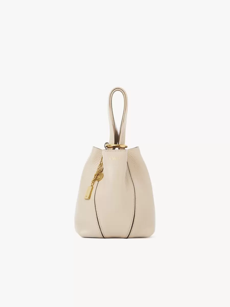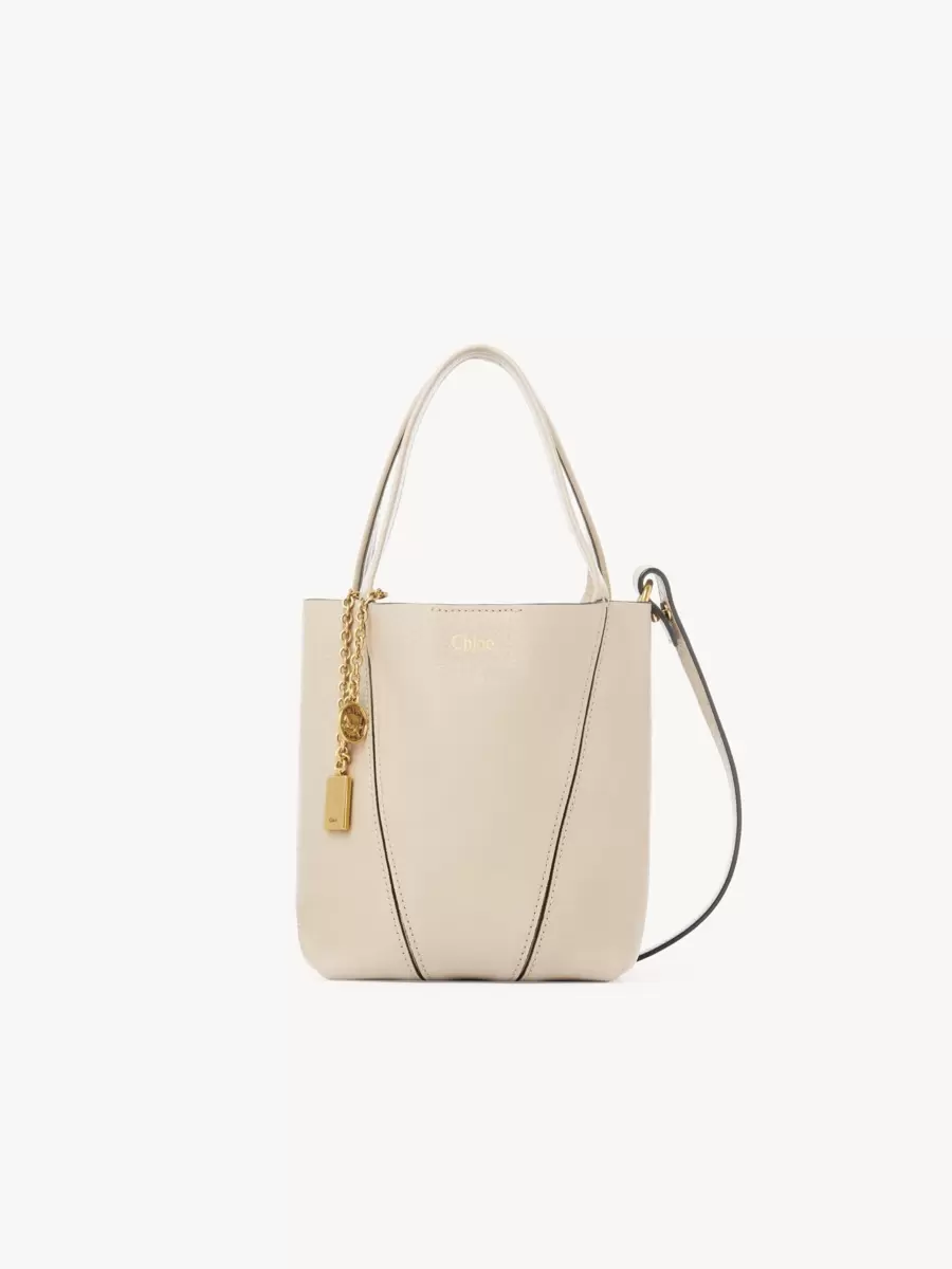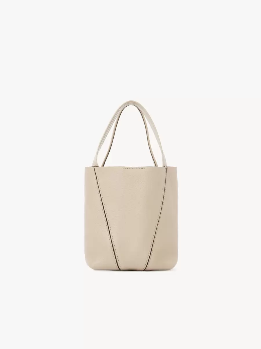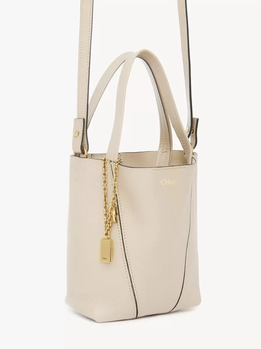 Crafted from shiny grained cowhide, the small Chloé Spin tote bag has a minimalist silhouette elevated with graphic lines. A dangling chain features the Maison’s signature Chloé and Horse Medals.